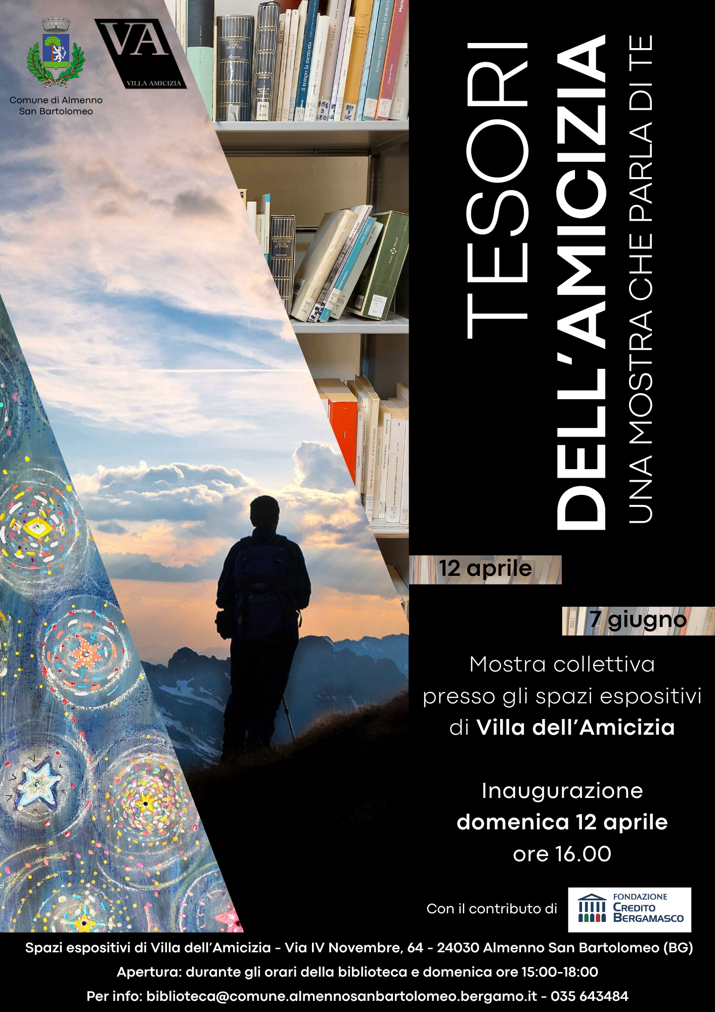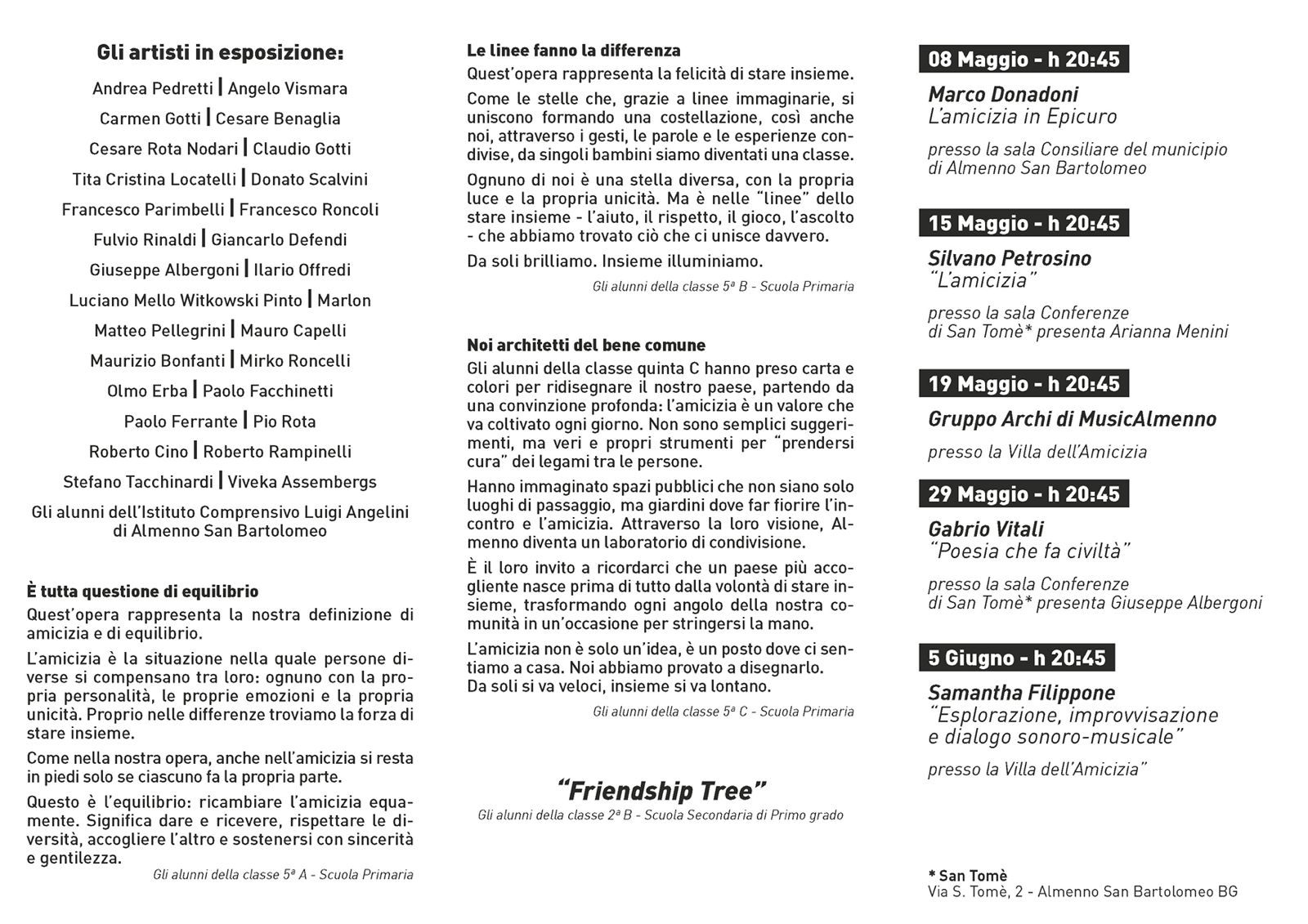 Dal 12 aprile al 7 giugno ci sarร la mostra collettiva ยซTesori dell'Amicizia - una mostra che parla di teยป, a cura di Giuseppe Albergoni, che si terrร presso la Villa dellโAmicizia, spazio espositivo dedicato alla valorizzazione dellโarte e degli artisti del territorio. Si tratta di un progetto espositivo articolato in tre sezioni, pensato per coinvolgere attivamente la comunitร : da un lato gli elaborati artistici e progettuali realizzati dagli studenti delle scuole dellโIstituto Comprensivo โLuigi Angeliniโ di Almenno San Bartolomeo; dallโaltro opere pittoriche, scultoree e fotografiche di artisti; infine una selezione di beni librari e culturali segnalati dagli utenti della biblioteca comunale.
