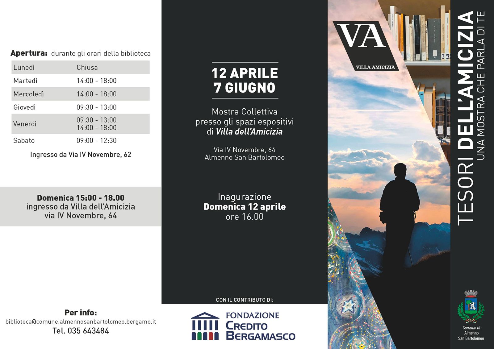 Lโinaugurazione della mostra sarร il 12 aprile 2026 alle 16 presso gli spazi espositivi della Villa dellโAmicizia in Almenno San Bartolomeo in Via IV Novembre n. 64. La mostra sarร visitabile fino al 7 giugno, durante la settimana con accesso e seguendo gli orari della biblioteca, mentre la domenica ore 15-18 con accesso diretto dal piazzale.