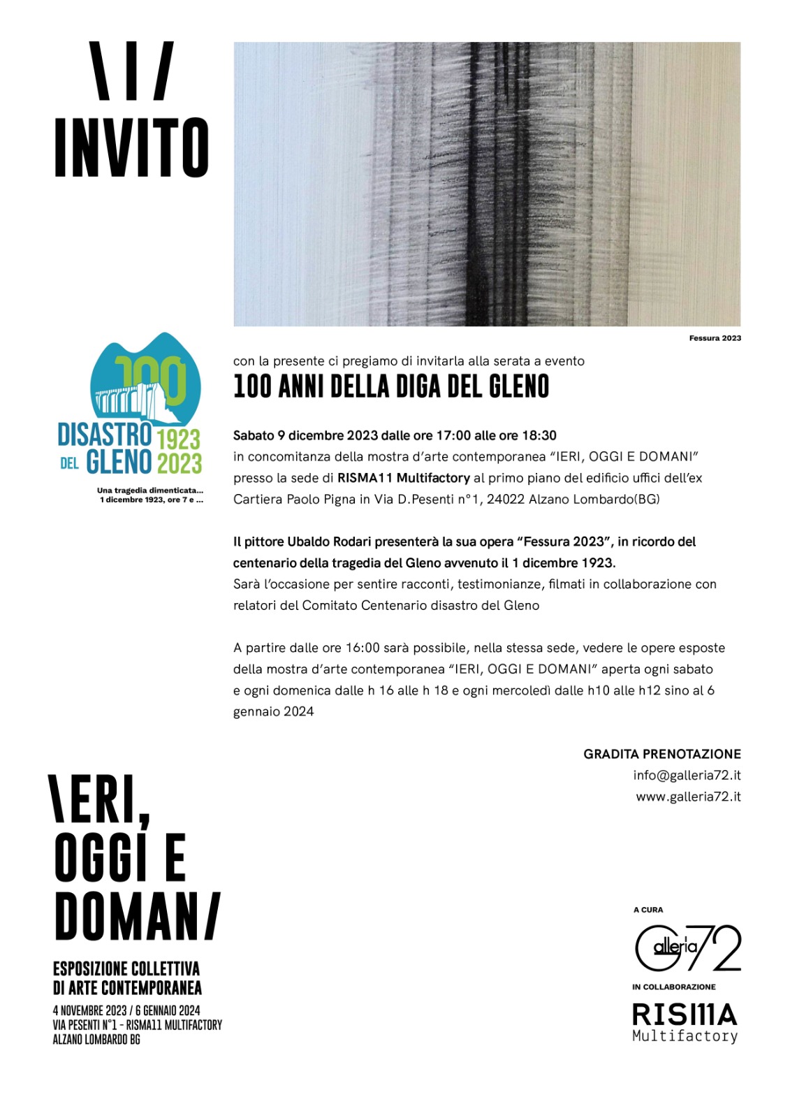 Sabato 9 dicembre 2023 a partire dalle ore 17:00 alle ore 18:30, in concomitanza della mostra d'arte contemporanea "Ieri, oggi e domani", presso la sede di RISMA11 Multifactory al primo piano del edificio uffici dell'ex Cartiera Paolo Pigna, si svolgerà la serata evento.