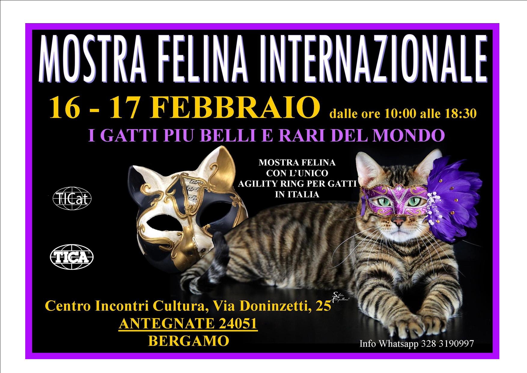 Sabato 16 e domenica 17 febbraio, al Centro Incontri Cultura di Antegnate, si terrà l'appuntamento di livello internazionale dedicato al mondo felino, dove saranno in concorso i gatti piu belli e le razze più rare provenienti da tutto il mondo per la premiazione.