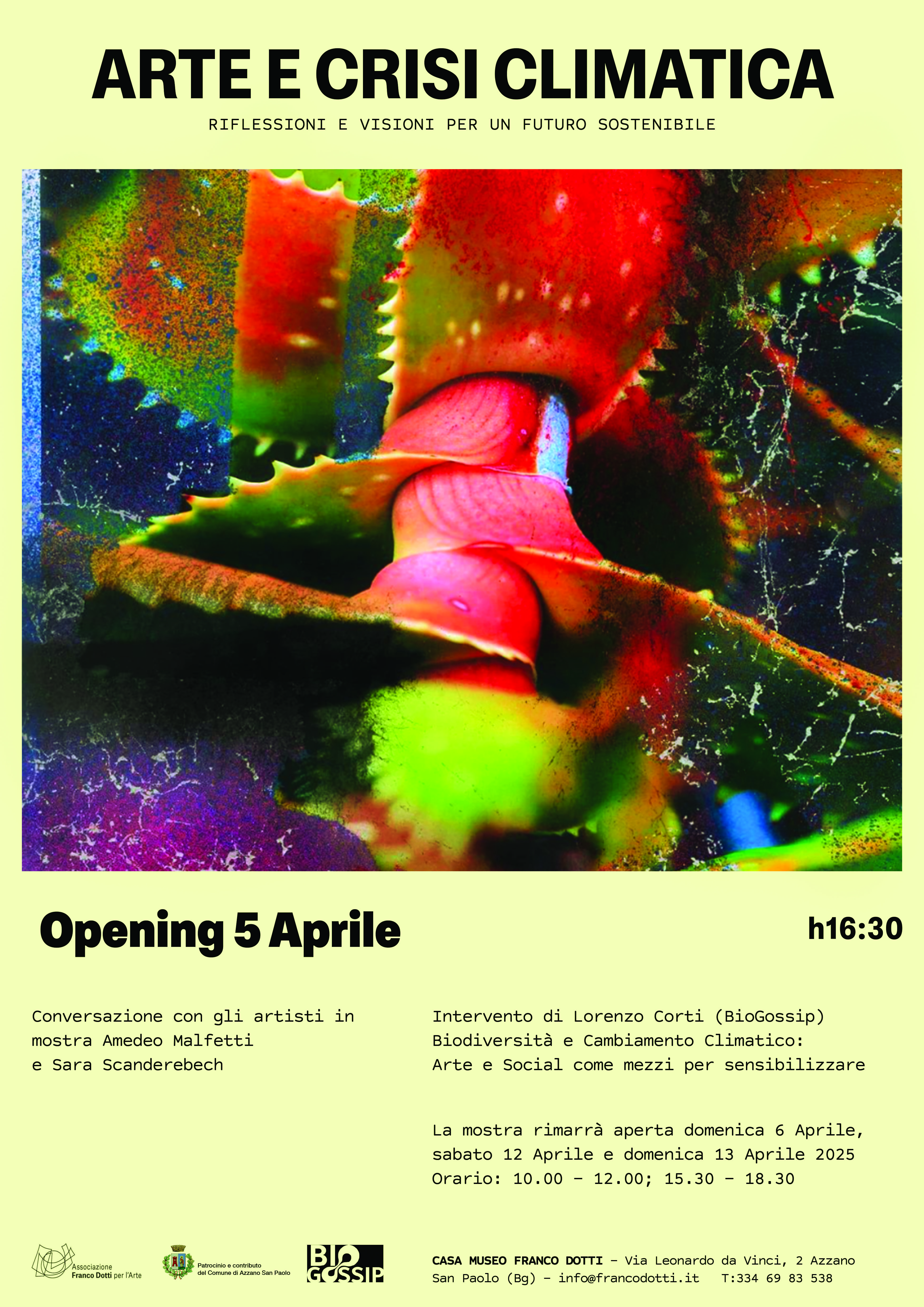 L'Associazione Franco Dotti per l'Arte invita alla partecipazione all'evento "ARTE e CRISI CLIMATICA - Riflessioni e visioni per un futuro sostenibile", che si terrà sabato 5 aprile presso la Casa Museo Franco Dotti. Il programma della giornata prevede, alle 16.30, l'inaugurazione della mostra degli artisti Amedeo Malfetti e Sara Scanderebech, seguita da un'intervista agli stessi. Le opere esposte offriranno una riflessione visiva sulla crisi climatica, esplorando il rapporto tra arte e sostenibilità. Alle 17 si terrà l'intervento di Lorenzo Corti, divulgatore scientifico e noto sui social con il nome di BIOGOSSIP. Il suo intervento affronterà il tema della biodiversità e del cambiamento climatico, con un focus sull'uso dell'arte e dei social media come strumenti di sensibilizzazione e informazione.