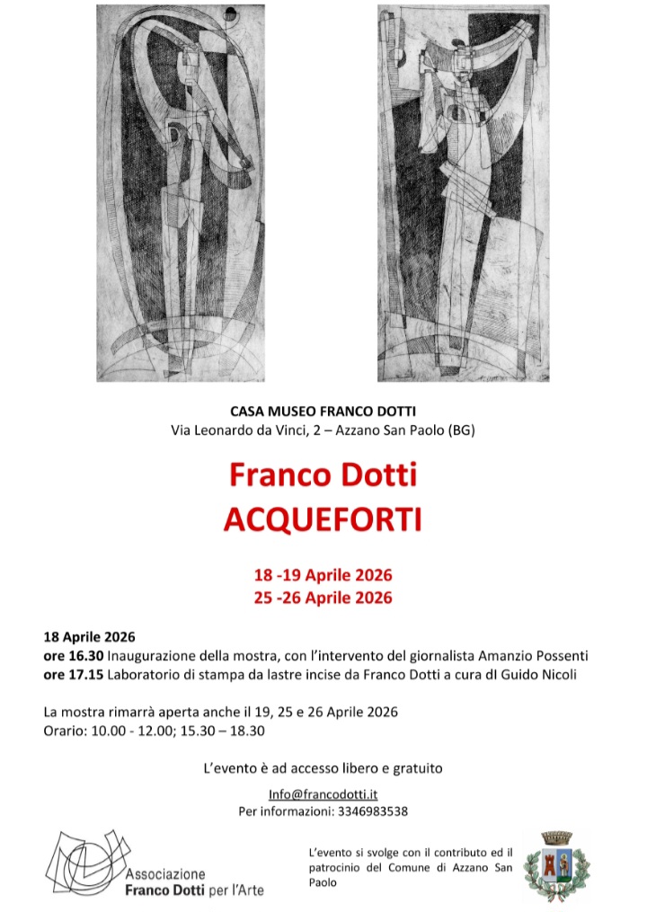 La mostra dal titolo ยซFranco Dotti โ Acquefortiยป si terrร presso la Casa Museo Franco Dotti, Via Leonardo da Vinci 2, Azzano San Paolo, e sarร inaugurata sabato 18 Aprile alle 16.30 con lโintervento del giornalista Amanzio Possenti; alle 17.15 si svolgerร un laboratorio di stampa, da lastre incise da Franco Dotti, a cura di Guido Nicoli.