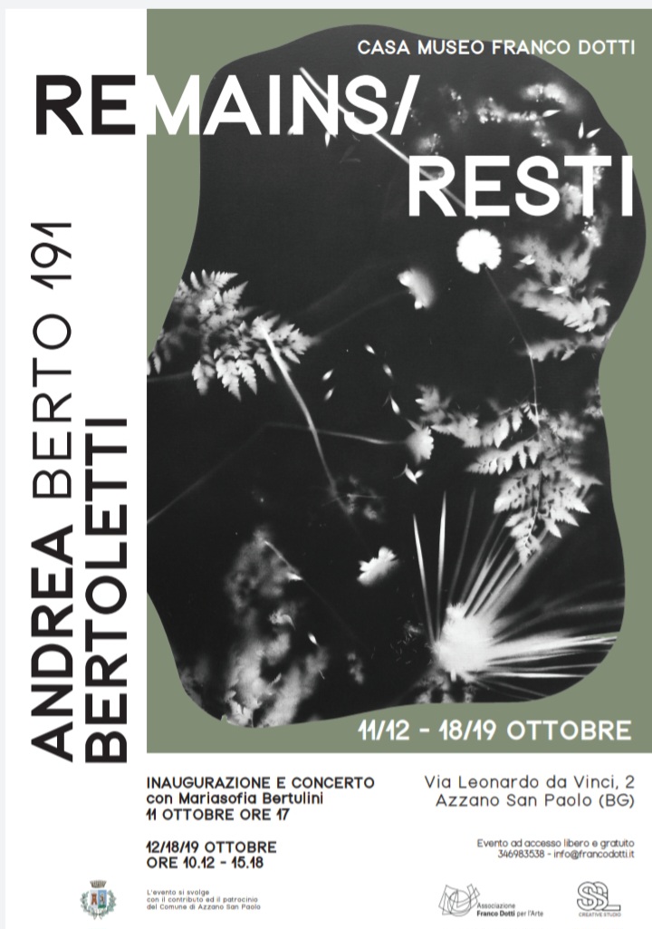 L'Associazione Franco Dotti per l'Arte inaugurerà sabato 11 ottobre 2025 alle 17, la mostra «Remains/Resti», dell'artista Andrea Bertoletti, presso la Casa Museo Franco Dotti.