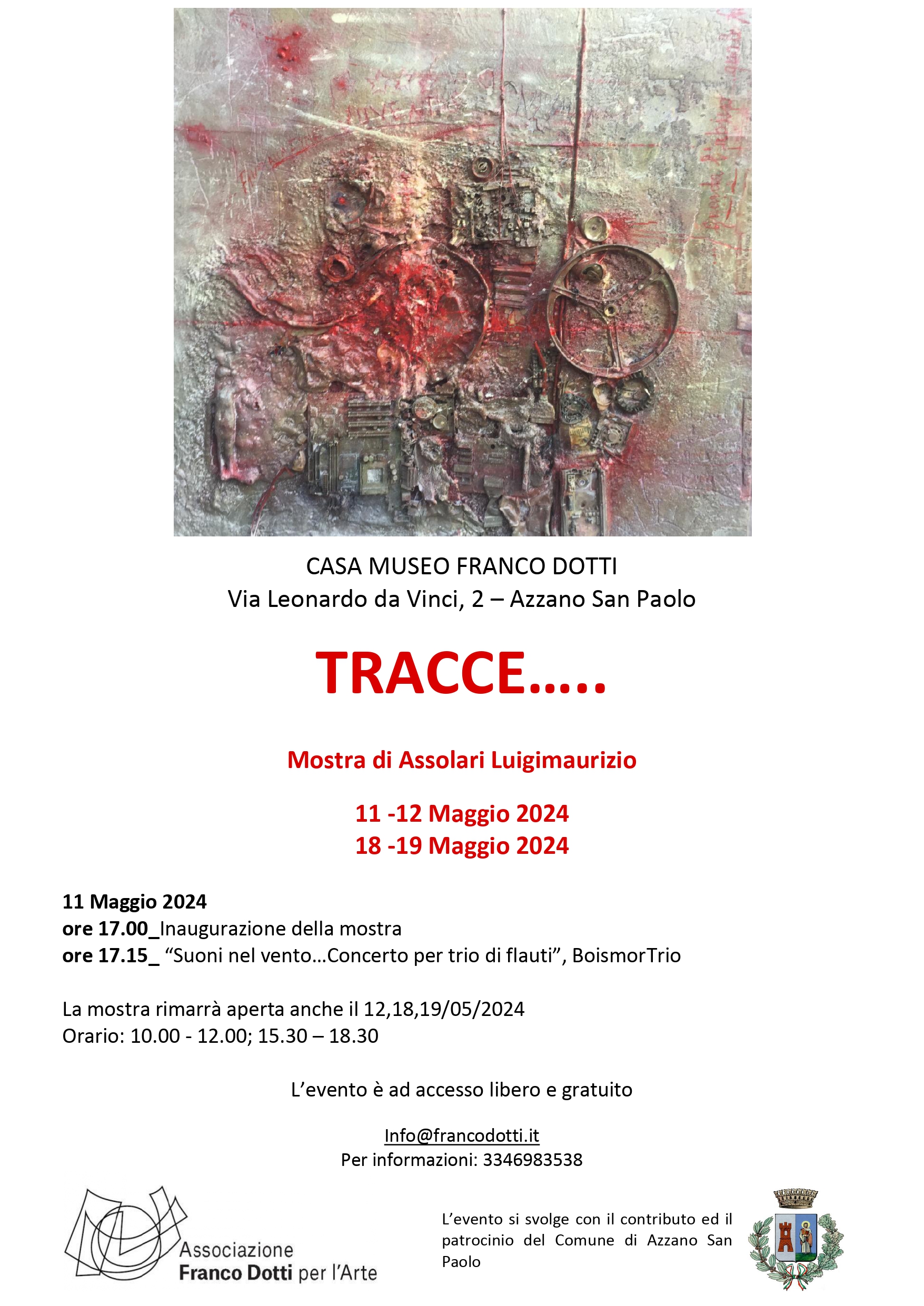 Sabato 11 Maggio 2024, alle 17.00, presso la Casa Museo Franco Dotti, l’Associazione Franco Dotti per l’Arte inaugurerà la mostra “TRACCE...”, con opere dell’artista bergamasco Luigimaurizio Assolari.