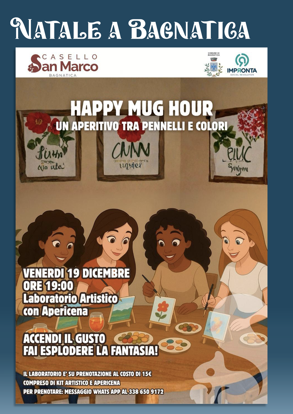 In occasione delle festività natalizie, Casello San Marco, in collaborazione con il Comune di Bagnatica e Impronta Social Revolution, propone un’esperienza creativa dedicata a chi desidera trascorrere una serata diversa dal solito, immersa nell’arte e nella convivialità.