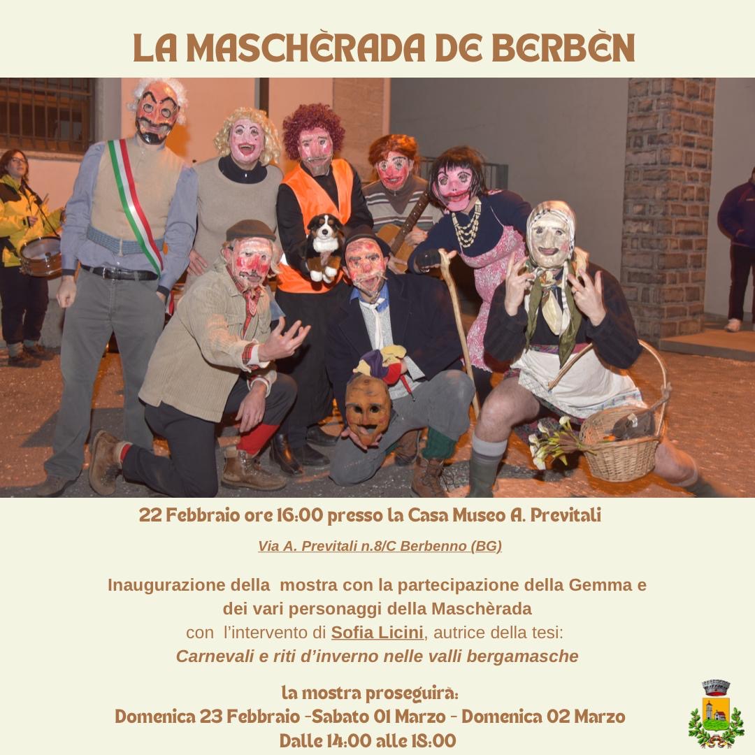 Il 22 febbraio alle ore 16 presso la Casa Museo A. Previtali avrà luogo l'inaugurazione della mostra dedicata alla tradizione della Mascherada de Berbèn. L’evento prevede la partecipazione della Gemma e dei vari personaggi tipici di questa storica manifestazione, che rappresenta un’importante tradizione folkloristica della valle.