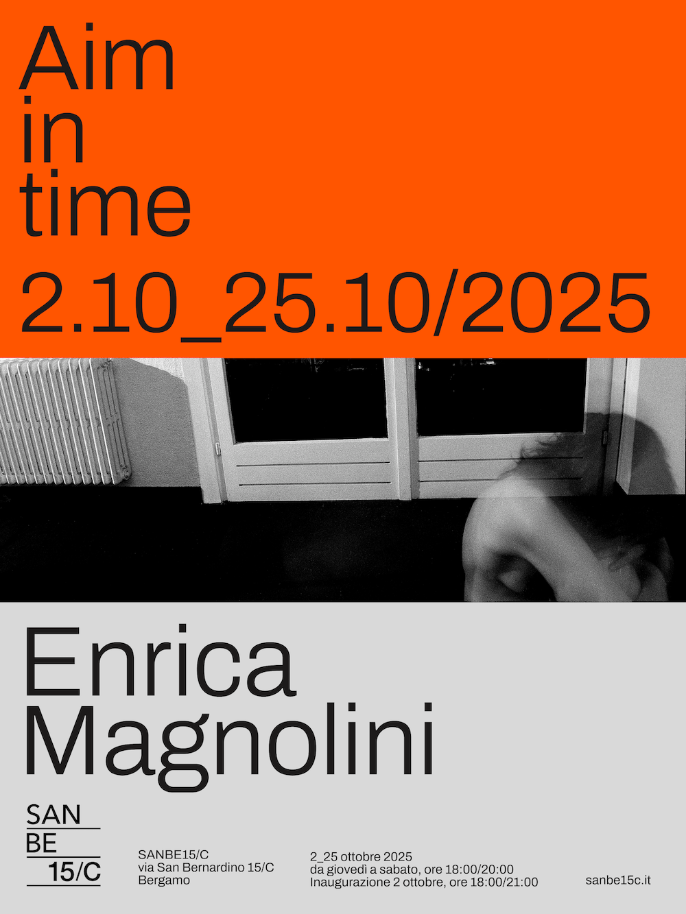 AIM IN TIME nasce da un’urgenza personale, libera da vincoli e da committenze, sviluppata da Enrica Magnolini nell’arco di quasi vent’anni attraverso pochi rulli analogici l’anno, sempre in bianco e nero, sviluppati a mano in camera oscura. A ispirare la ricerca, la scoperta del lavoro di Francesca Woodman, che ha aperto all'autrice la possibilità di indagare sé stessa come soggetto e presenza in trasformazione. Un progetto che esclude l'utilizzo del digitale sia in ripresa che in stampa e che, nell'esposizione di SANBE15/C gallery si manifesta attraverso 21 immagini, spesso realizzate in interni e in luoghi intimi, dove il corpo appare e scompare, si riflette o si dissolve nello sfondo, restituendo visivamente la condizione fragile e mutevole dell’essere nel tempo. I lunghi tempi di posa e l’effetto di metamorfosi generano immagini sospese, che diventano tracce di un Io esistenziale in divenire. Ne emerge una narrazione per frammenti, sottile e non lineare, capace di aprirsi allo sguardo dell'altro e di trasformarsi in un racconto condiviso.