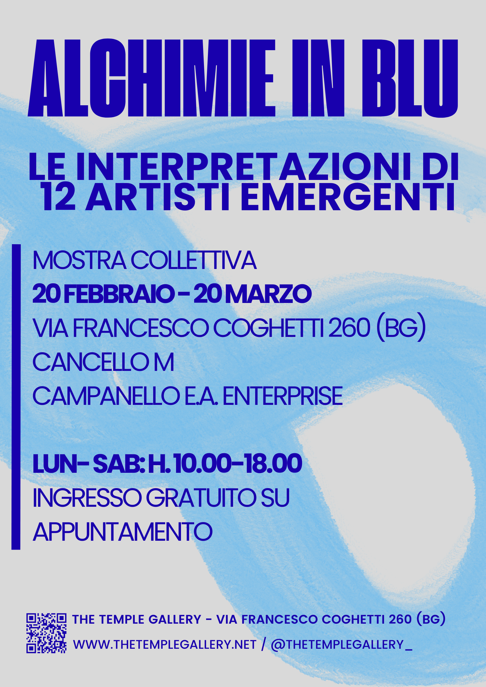 Alla Galleria d'arte The Temple Gallery di Bergamo, è in programma una nuova mostra collettiva, con la partecipazione di 12 artisti emergenti. un percorso immersivo che invita ad esplorare le molteplici declinazioni concettuali, emotive del colore blu.