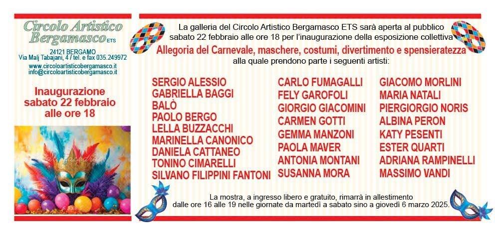 Il Carnevale, con il suo spirito di allegria e leggerezza, sarà il protagonista della nuova esposizione collettiva Allegoria del Carnevale che inaugura sabato 22 febbraio alle ore 18 presso la Galleria del Circolo Artistico Bergamasco. L'evento offrirà un'interpretazione artistica del Carnevale attraverso una selezione di opere realizzate da numerosi artisti, tra cui Sergio Alessio, Gabriella Baggio, Balò, Paolo Bergo, Lella Buzzacchi, Marinella Canonico, Daniela Cattaneo, Tonino Cimarelli, Silvano Filippini Fantoni, Carlo Fumagalli, Fely Garofoli, Giorgio Giacomini, Carmen Gotti, Gemma Manzoni, Paola Maver, Antonia Montani, Susanna Mora, Giacomo Morlini, Maria Natali, Piergiorgio Noris, Albina Peron, Katy Pesenti, Ester Quarti, Adriana Rampinelli, e Massimo Vandi.