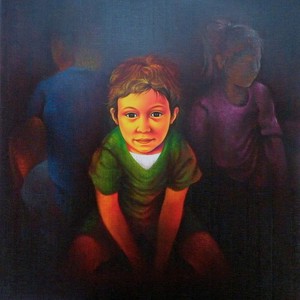 I volti animati dei bambini sono dipinti con colori caldi, mentre i contorni intorno a loro sono sfumati, creando un'atmosfera vivace che riflette la natura giocosa dei soggetti. Fusili utilizza una tecnica originale, combinando diverse tipologie di tela e utilizzando oli su superfici lisce e ruvide per enfatizzare la luminosità dei volti.