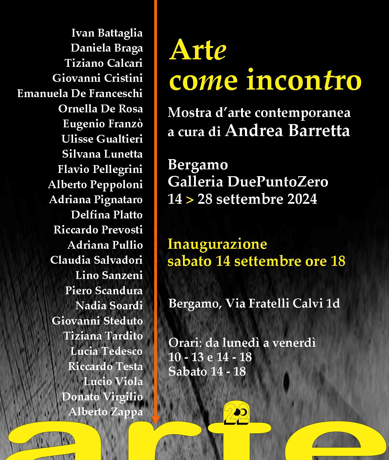 “Arte come incontro” attrae l’occhio e tocca l’anima, a vivificare un panorama diverso nel fornire diversità, nelle inesauribili combinazioni sui contenuti, nel compito primario dell’artista di far sentire la sua voce, nell’illuminare la società e dare impulso alle emozioni. Nella contemplazione delle opere presenti, con la loro iconicità paradigmatica, in una partenza che trova un traguardo nelle sale della Galleria DuePuntoZero dove si palesa qualcosa di inatteso, con una maggiore cognizione dello sguardo che accresca la rivelazione interiore dell’arte in un progetto che racchiude una rilevanza socio-culturale per la sua sopravvivenza. Perché si manifesta nel suo percorso espositivo come opportunità di riflessione. “Perché l’arte, è bene ripeterlo, è gratuità, e non c’è bisogno di un lampo di genio per interrogarla”, scrive Andrea Barretta. E una mostra collettiva è sempre un’occasione per accedervi come in un diario, per raccontarla, per rintracciare la capacità di evocare la bellezza quale frammento in cui l’improbabile diventa plausibile.