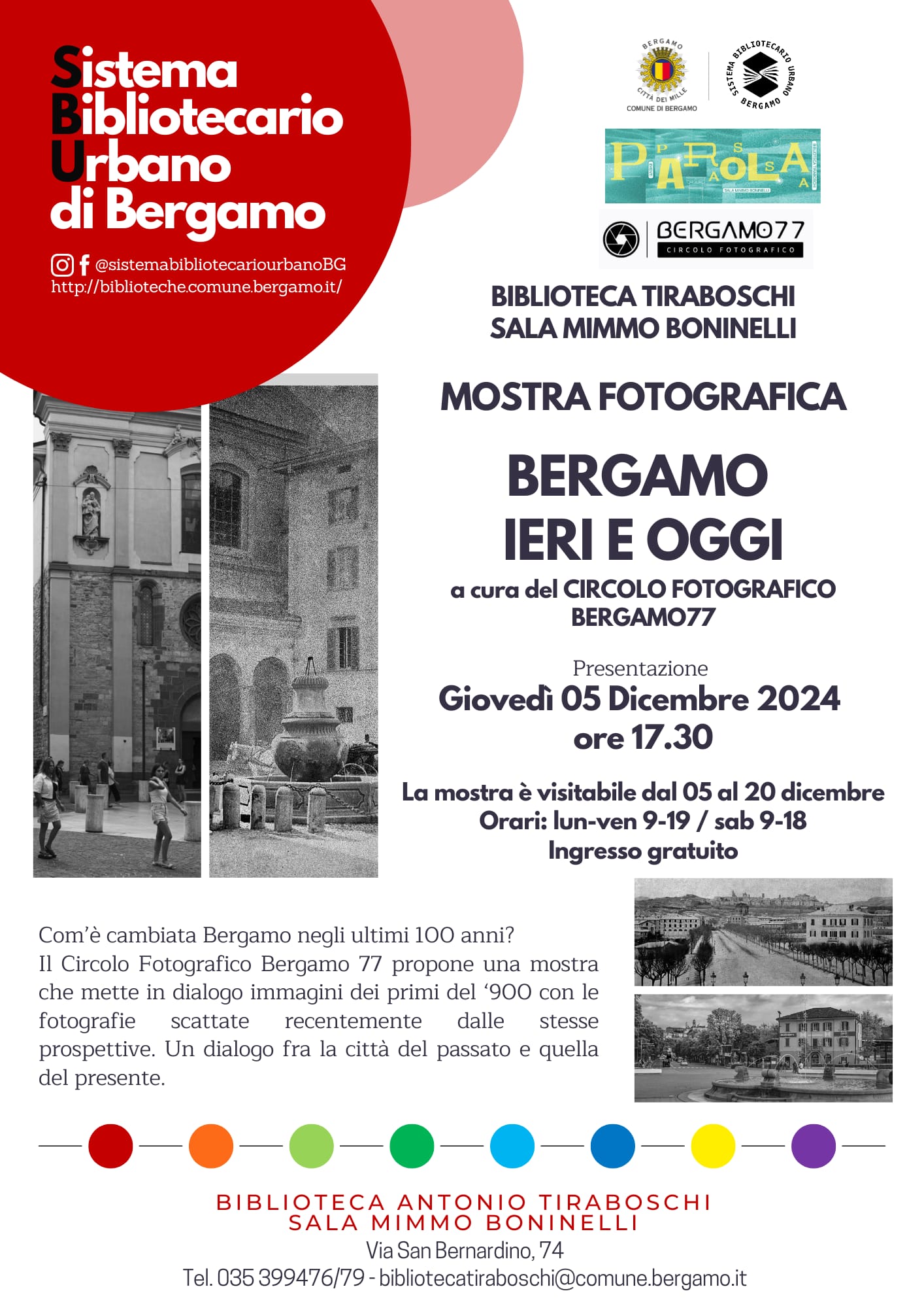 Il Circolo Fotografico Bergamo77 invita tutti a una riflessione visiva sulla trasformazione della nostra città attraverso il tempo, presentando una mostra unica che mette in dialogo le immagini storiche dei primi del '900 con quelle recenti scattate dalle stesse prospettive. Un dialogo fra la città del passato e quella del presente. In questa esposizione, passato e presente si incontrano, raccontando le trasformazioni urbane, culturali e sociali che hanno plasmato Bergamo nel corso di un secolo. Le fotografie antiche, spesso in bianco e nero, ci raccontano una Bergamo che sembra lontana, ma che si svela ancora presente nei dettagli della città odierna, immortalata in scatti contemporanei. Le medesime angolazioni, gli stessi luoghi, ma con una città che cambia, si rinnova e si evolve.