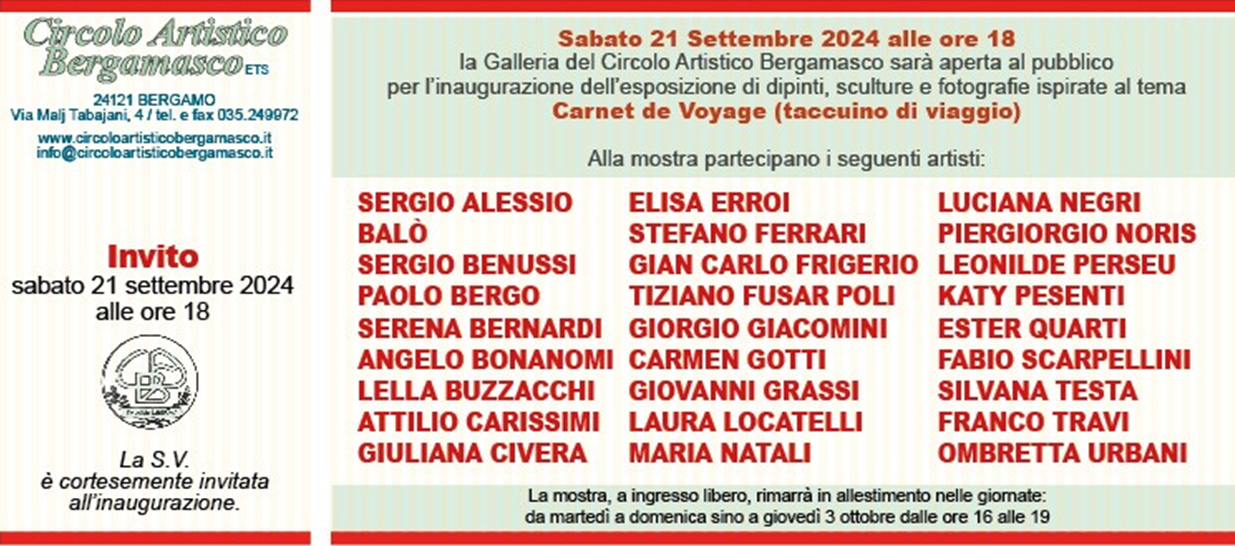 Carnet de Voyage: un itinerario artistico. Il Circolo Artistico Bergamasco è lieto di annunciare l'apertura della mostra collettiva "Carnet de Voyage". A partire dal 21 settembre, la galleria ospiterà le opere di numerosi artisti, che attraverso dipinti, sculture e fotografie ci invitano a esplorare mondi lontani e a riflettere sul senso del viaggio. L'esposizione sarà aperta al pubblico fino al 3 ottobre.