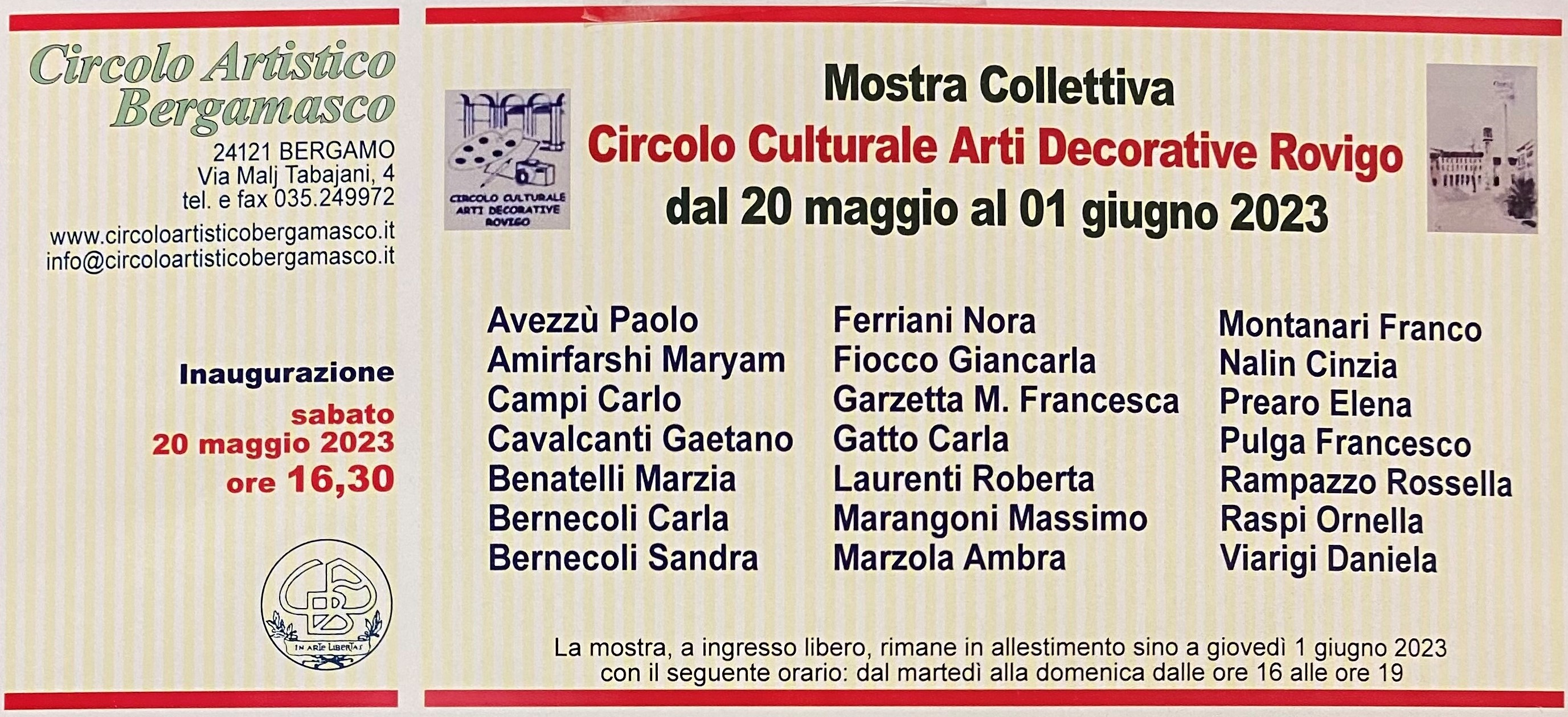Sabato 20 maggio alle 16,30 la Galleria del Circolo Artistico Bergamasco sarà aperta al pubblico per l’inaugurazione della esposizione di dipinti e fotografie dei seguenti artisti associati al Circolo Culturale Arti Decorative Rovigo: Paolo Avezzù, Maryam Amirfarshi, Carlo Campi, Gaetano Cavalcanti, Marzia Benatelli, Carla Bernecoli, Sandra Bernecoli, Nora Ferriani, Giancarla Fiocco, Maria Francesca Garzetta, Carla Gatto, Roberta Laurenti, Massimo Marangoni, Ambra Marzola, Franco Montanari, Cinzia Nalin, Elena Prearo, Francesco Pulga, Rossella Rampazzo, Ornella Raspi, Daniela Viarigi.