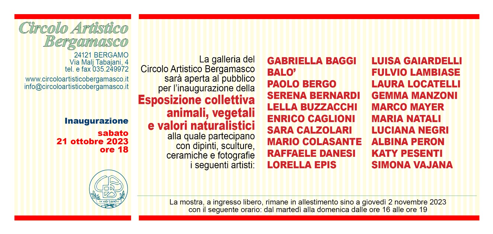 La galleria del Circolo Artistico Bergamasco sarร aperta al pubblico per lโinaugurazione della esposizione Collettiva animali, vegetali e valori naturalistici alla quale partecipano con dipinti, sculture, ceramiche e fotografie.