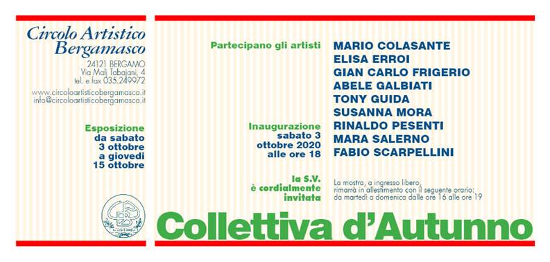 La Galleria del Circolo Artistico Bergamasco (via Malj Tabajani, 4) sarà aperta al pubblico dalle ore 18.00 di sabato 3 ottobre per l’inaugurazione dell’esposizione Collettiva d’Autunno 2020 con la partecipazione di: Mario Colasante, Elisa Erroi, Gian Carlo Frigerio, Abele Galbiati, Tony Guida, Susanna Mora, Rinaldo Pesenti, Mara Salerno, Fabio Scarpellini.