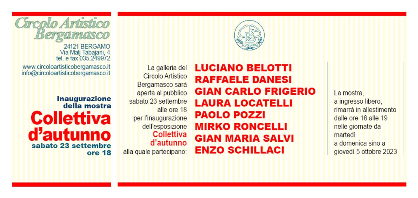 La Galleria del Circolo Artistico Bergamasco sarà aperta al pubblico dalle ore 16 alle ore 19 nelle giornate da martedì a domenica per l’esposizione Collettiva d’Autunno 2023 con la partecipazione di: