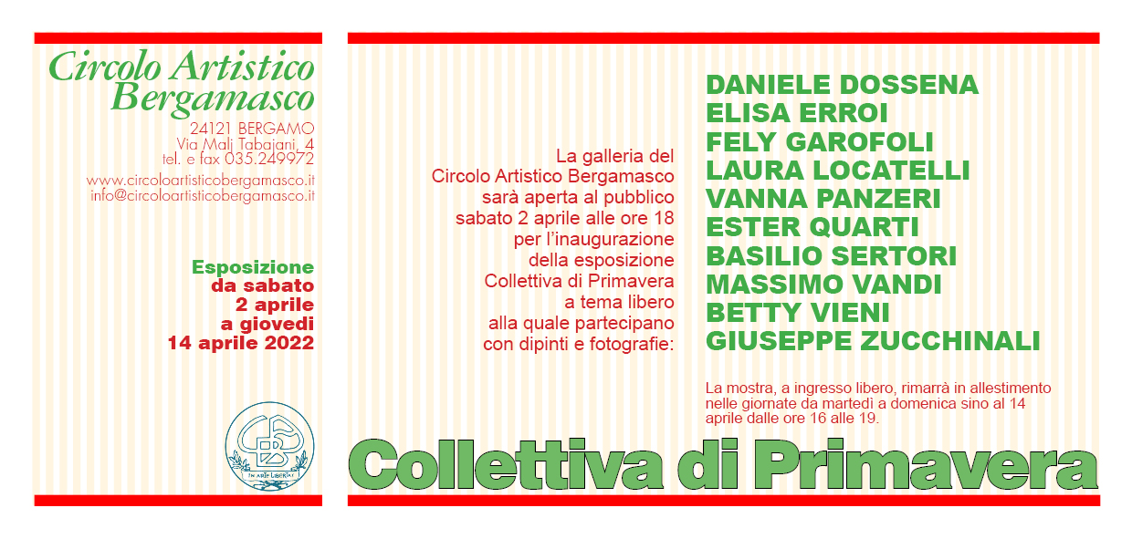 Sabato 2 aprile alle ore 18, presso il Circolo Artistico Bergamasco, si terrà l'inaugurazione della mostra "Collettiva di Primavera" che rimarrà in allestimento fino a giovedì 14 aprile e sarà visitabile dal martedì alla domenica dalle 16 alle 19.