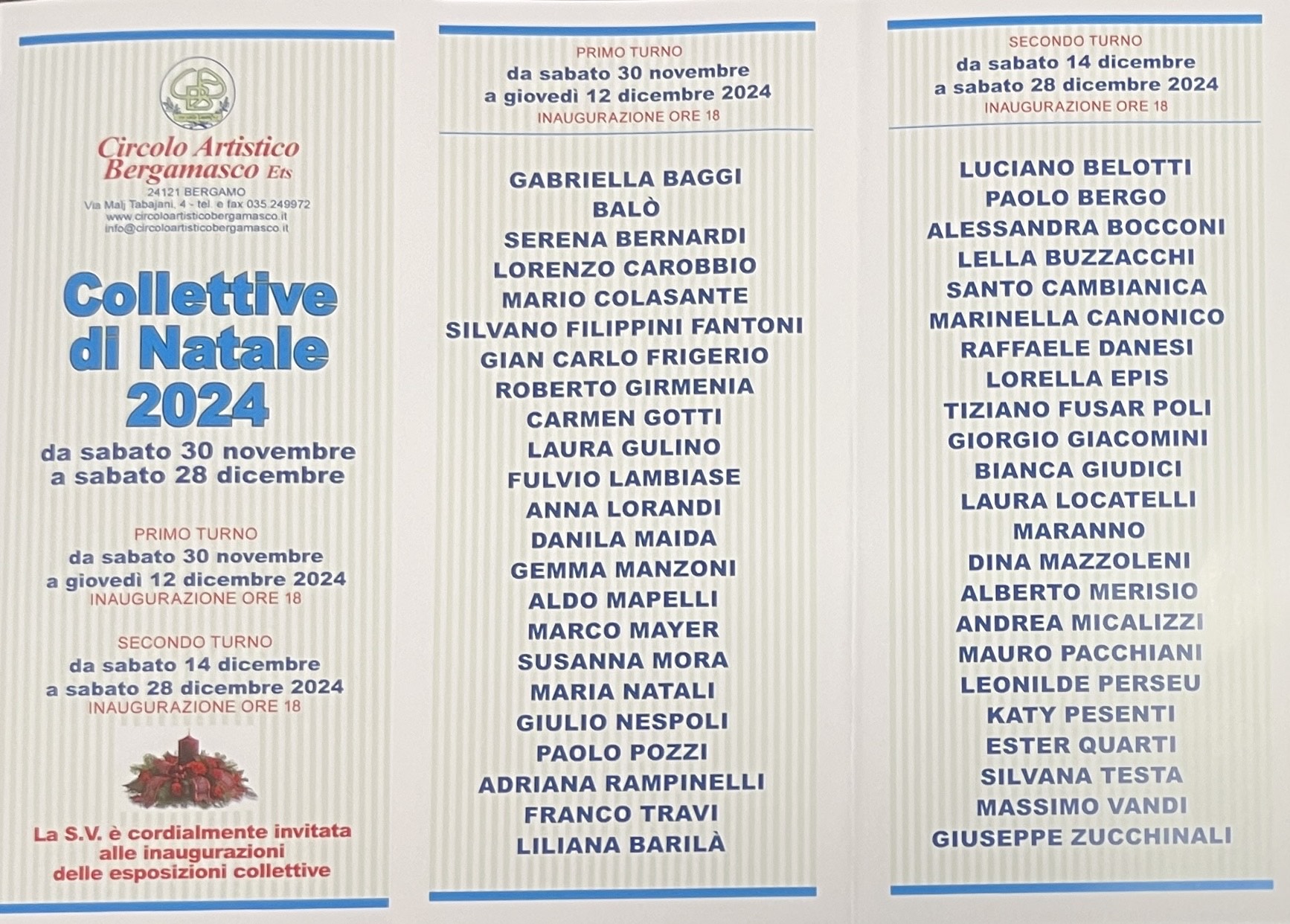 La Galleria del Circolo Artistico Bergamasco ETS inaugura, sabato 30 novembre alle 18, la prima parte della tradizionale Esposizione Collettiva di Natale. La mostra, dal tema libero, vede la partecipazione di numerosi artisti di talento che propongono opere ispirate al Natale e alle festività, offrendo un'ampia varietà di stili e tecniche artistiche.