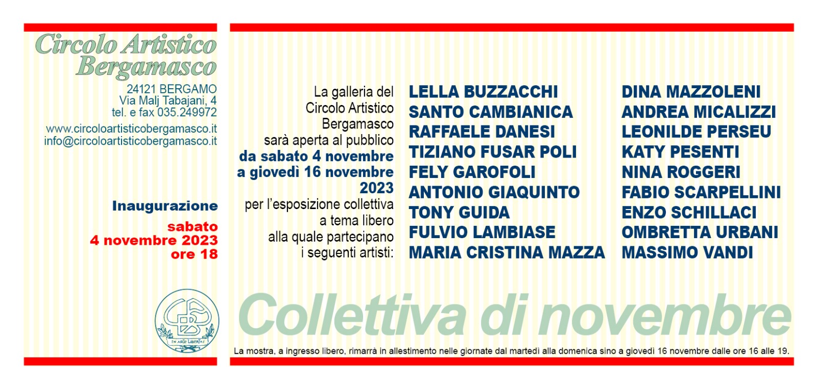 La galleria del Circolo Artistico Bergamasco sarร aperta al pubblico sabato 4 novembre 2023 alle ore 18 per lโinaugurazione dellโesposizione Collettiva di Novembre a tema libero alla quale partecipano i seguenti artisti: