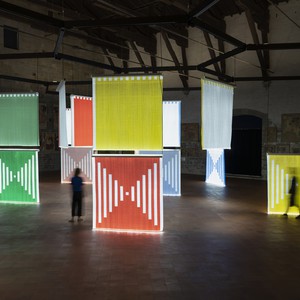I teli in fibra luminosa sono l’esito ultimo della ricerca di Buren, la parte recente e aggiornata di un percorso creativo originale e celebrato. Essi non rappresentano soltanto l’evoluzione tecnologica di concetti e principi compositivi consolidati, ma costituiscono, a tutti gli effetti, una nuova condizione costruttiva, un nuovo modo di esistere nello spazio, in ragione delle loro peculiari qualità intrinseche, del loro essere portatori interni di sostanza raggiante e, allo stesso tempo, fonte di luce per gli ambienti.