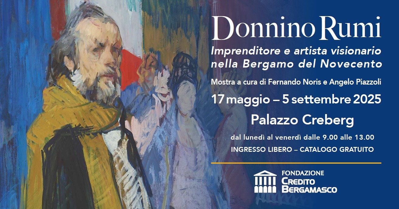 La mostra “Donnino Rumi. Imprenditore e artista visionario nella Bergamo del Novecento” – a cura di Fernando Noris e Angelo Piazzoli – verrà inaugurata sabato 17 maggio (ore 17) in occasione della prima apertura straordinaria del Palazzo Storico del Credito Bergamasco (14,30-19).