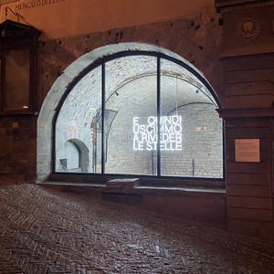 Per tutta l'estate una scritta al neon ispirata ai versi della Divina Commedia dantesca illumina Piazza Mercato delle Scarpe.