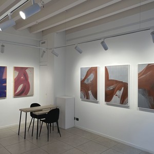 Alcune opere si strutturano su diversi fogli di carta che, uniti da un unico gesto pittorico, diventano poi opere a sé stanti, diversi capitoli di un unico racconto; in questa mostra sono allestite volutamente con l’intento di non ricreare la composizione originale, focalizzando l’attenzione dell’osservatore sulla singola opera e giocando con l’immaginazione a ricreare il gesto come è stato concepito.