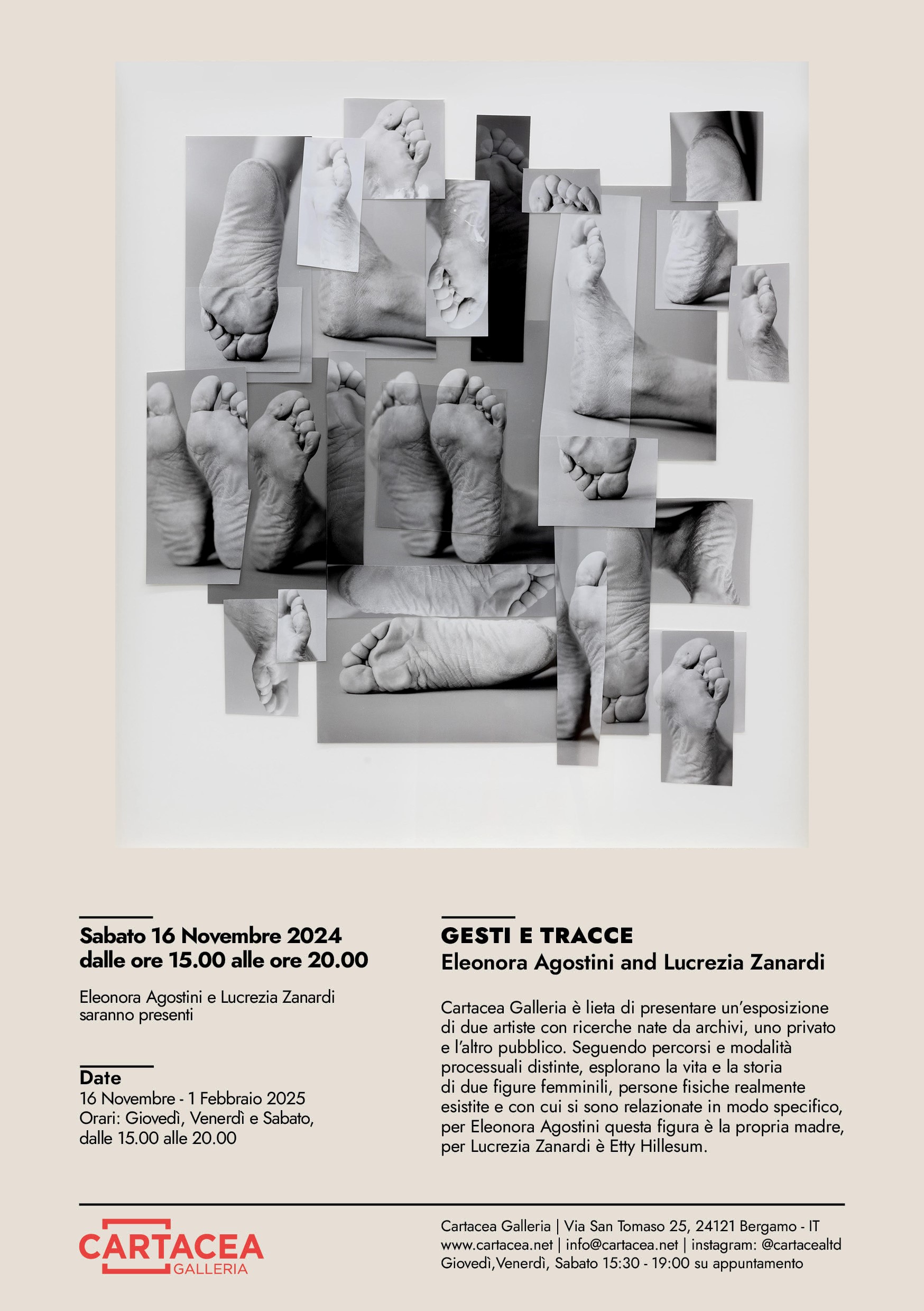 Cartacea Galleria ospita "Gesti e Tracce", una mostra che raccoglie il lavoro di due artiste, Eleonora Agostini e Lucrezia Zanardi, il cui approccio alla ricerca artistica si sviluppa a partire da archivi: uno privato, legato alla vita personale, e uno pubblico, che racconta una storia universale e profondamente umana. Le due artiste, pur seguendo percorsi distinti, sono unite da un filo conduttore che esplora la vita e la memoria di figure femminili che, seppur in contesti differenti, hanno lasciato un'impronta significativa nella storia.