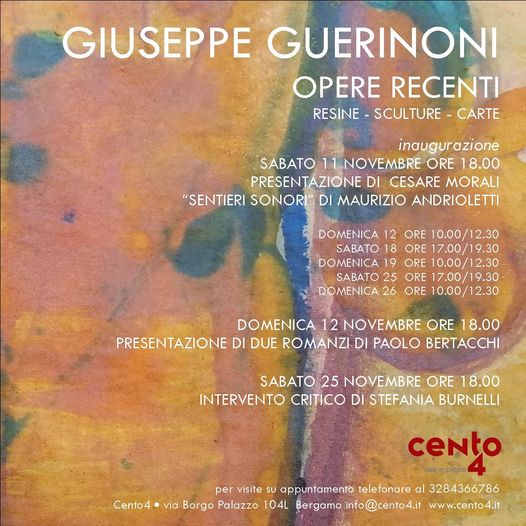 Presso lo spazio Cento4, sabato 11 novembre, avrร luogo l'inaugurazione della mostra di Giuseppe Guerinoni "Resine - sculture - carte".