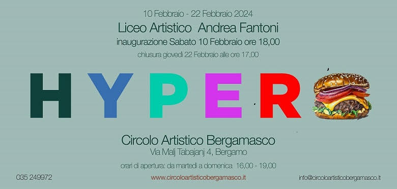 Nella galleria del Circolo Artistico Bergamasco sarà inaugurata l’esposizione di elaborati con soggetti diversi eseguiti dagli studenti del Liceo Artistico “Andrea Fantoni” di Bergamo - indirizzo arti figurative. La mostra, che si intitola Hyper, approfondisce con finalità didattiche le raffigurazioni visivamente accattivanti e dettagliate del movimento iperrealista.