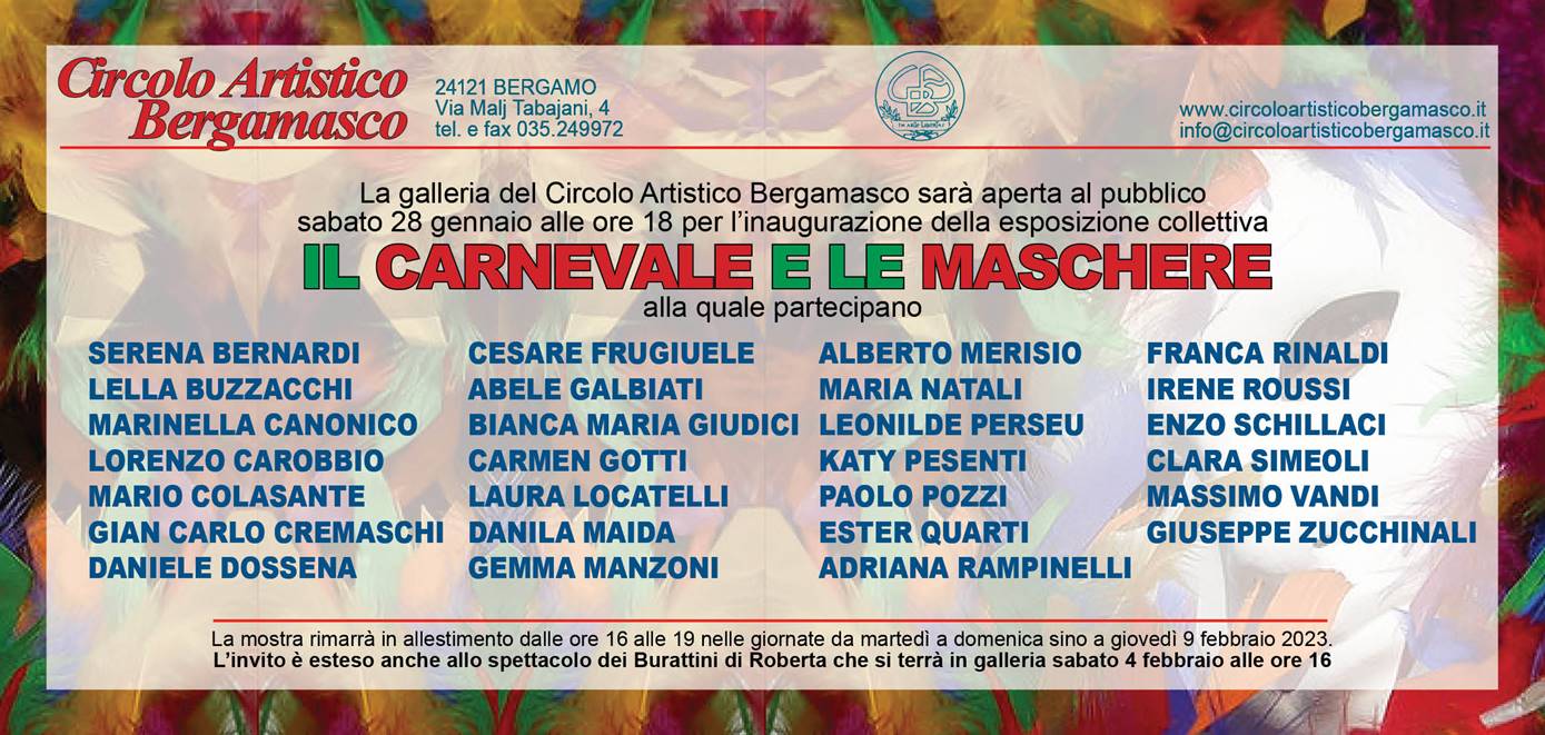 La galleria del Circolo Artistico Bergamasco sarà aperta al pubblico sabato 28 gennaio alle ore 18 per l’inaugurazione della esposizione collettiva "Il Carnevale e le maschere" alla quale partecipano: