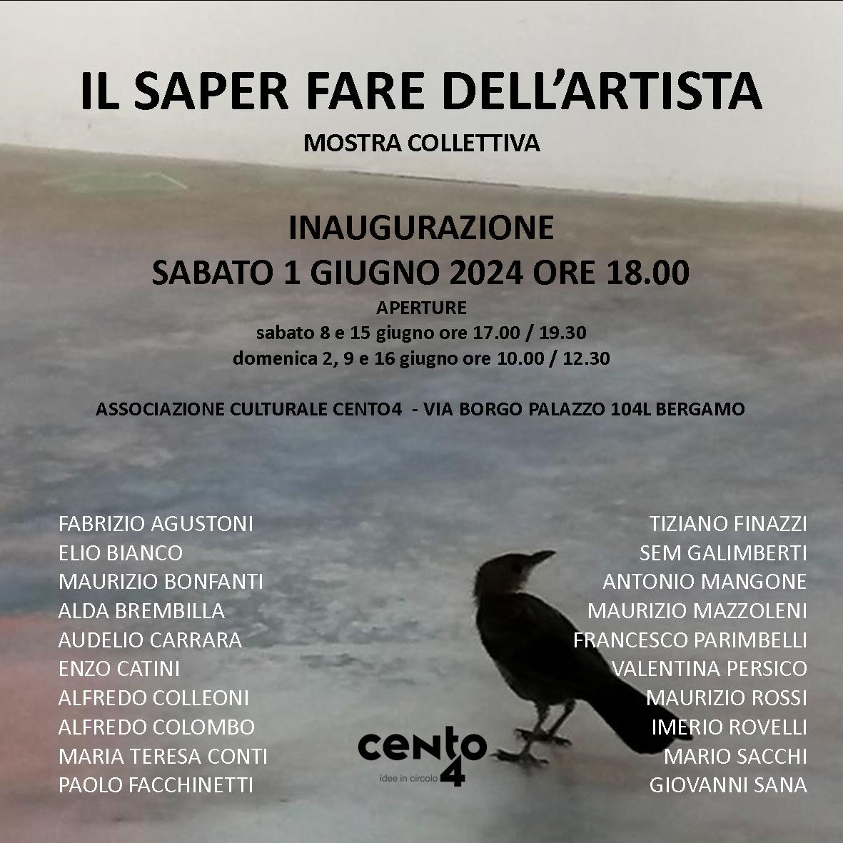 Al Cento4 di Bergamo il primo weekend della mostra collettiva che espone le opere di 20 artisti: Fabrizio Agustoni, Elio Bianco, Maurizio Bonfanti, Alda Brembilla, Audelio Carrara, Enzo Catini, Alfredo Colleoni, Alfredo Colombo , Maria Teresa Conti, Paolo Facchinetti, Tiziano Finazzi, Sem Galimberti, Antonio Mangone, Maurizio Mazzoleni, Francesco Parimbelli, Valentina Persico, Maurizio Rossi,Imerio Rovelli, Mario Sacchi e Giovanni Sana.