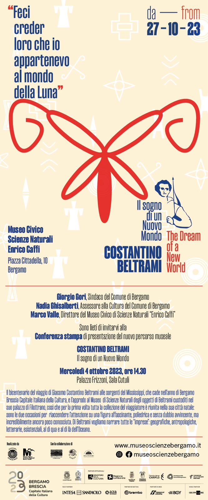 Il bicentenario del viaggio di Giacomo Costantino Beltrami alle sorgenti del Mississippi, che cade nell'anno di Bergamo Brescia Capitale della Cultura, e l'approdo al Museo di Scienze Naturali degli oggetti di Beltrami custoditi nel suo palazzo di Filottrano, così che per la prima volta tutta la collezione del viaggiatore è riunita nella sua città natale: sono le due occasioni per riaccendere l'attenzione su una figura affascinante, poliedrica e senza dubbio avvincente, ma incredibilmente ancora poco conosciuta. Di Beltrami vogliamo narrare tutte le "imprese": geografiche, antropologiche, letterarie, esistenziali, al di qua e al di là dell'Oceano.