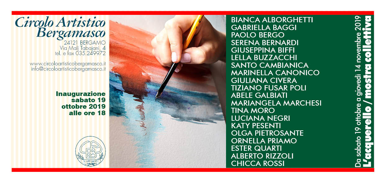 La Galleria del Circolo Artistico Bergamasco ha inaugurato sabato 19 ottobre l’esposizione «L’Acquerello» con la partecipazione di Bianca Alborghetti, Gabriella Baggi, Paolo Bergo, Serena Bernardi, Giuseppina Biffi, Lella Buzzacchi, Santo Cambianica, Marinella Canonico, Giuliana Civera, Tiziano Fusar Poli, Abele Galbiati, Mariangela Marchesi, Luciana Negri, Katy Pesenti, Olga Pietrosante, Ornella Priamo, Ester Quarti, Alberto Rizzoli, Chicca Rossi.