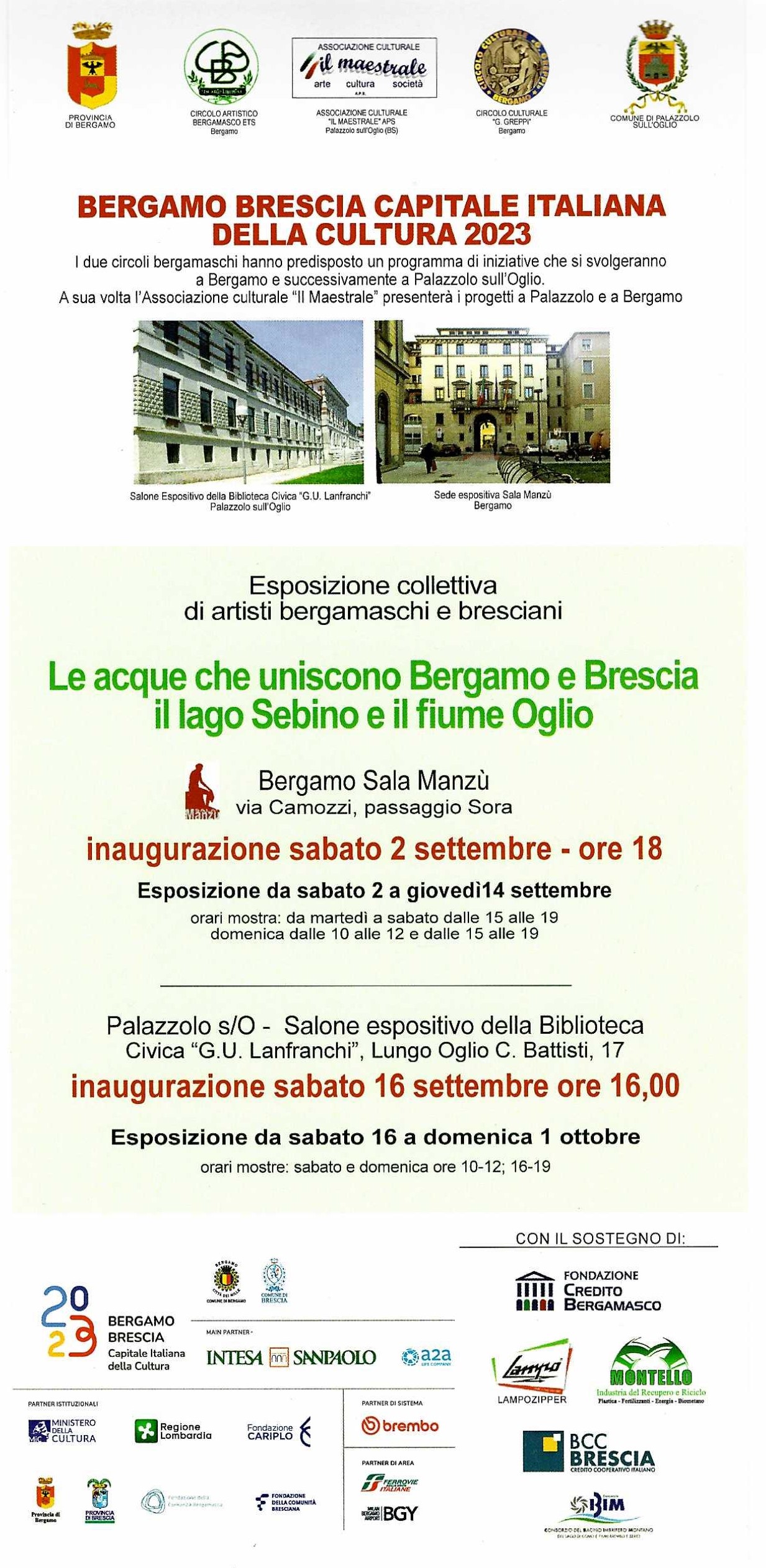 Il Circolo Artistico Bergamasco ETS, il Circolo Culturale Greppi e lโAssociazione Culturale โIl Maestraleโ APS di Palazzolo sullโOglio organizzano unโesposizione collettiva di pittura, acquerello, scultura e fotografia aperta agli artisti bergamaschi e bresciani ispirata al tema: Le acque che uniscono le province di Bergamo e di Brescia: lago Sebino e fiume Oglio. Lโesposizione collettiva sarร allestita alla Sala Manzรน della Provincia di Bergamo dal 2 al 14 settembre e al Salone espositivo della Biblioteca Civica Lanfranchi di Palazzolo sullโOglio dal 16 settembre al 1ยฐ ottobre 2023. Il tema dellโesposizione permette di sviluppare le visioni cariche di fascino dei territori e delle comunitร che caratterizzano le rive del lago Sebino e le sponde del fiume Oglio appartenenti alle due province.