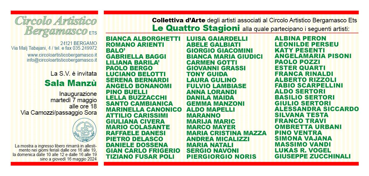 Il Circolo Bergamasco Artistico ETS organizza un'esposizione collettiva sul tema de "Le Quattro Stagioni": in mostra vi sono dipinti, ceramiche, sculture e fotografie degli artisti associati al Circolo i quali propongono il personale mondo creativo attraverso multiformi linguaggi espressivi, svariate tecniche e differenti sensibilità cromatiche.