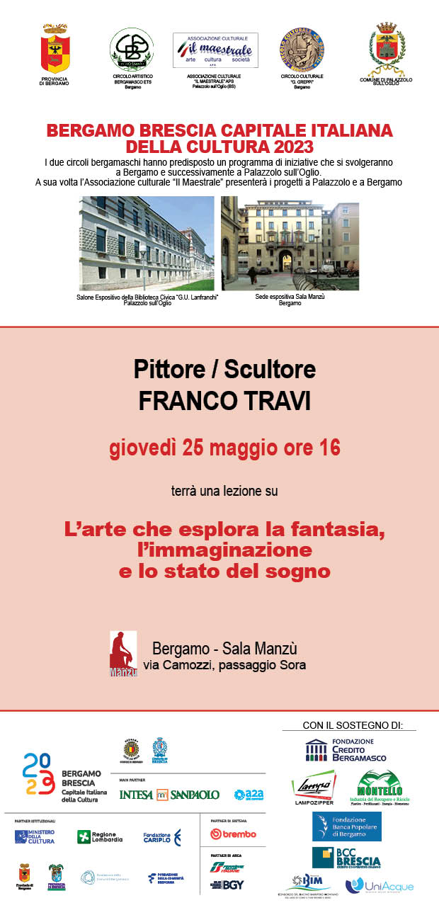 Nellโambito del programma di iniziative organizzate dal Circolo Artistico Bergamasco ETS, dal Circolo Culturale Greppi e dallโassociazione il Maestrale Aps di Palazzolo sullโOglio, per lโitinerario che comprende il palinsesto Bergamo-Brescia capitale italiana della cultura, il pittore e scultore Franco Travi terrร una lezione su "Lโarte che esplora la fantasia, lโimmaginazione e lo stato del sogno".