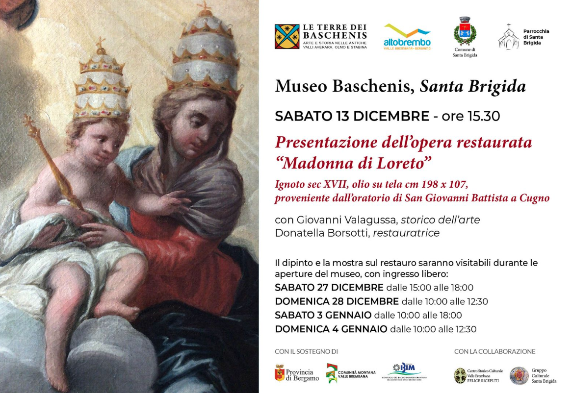 La Presentazione dell'opera restaurata Madonna di Loreto si svolge presso il Museo Baschenis a Santa Brigida il giorno Sabato 13 Dicembre con inizio alle 15:30.