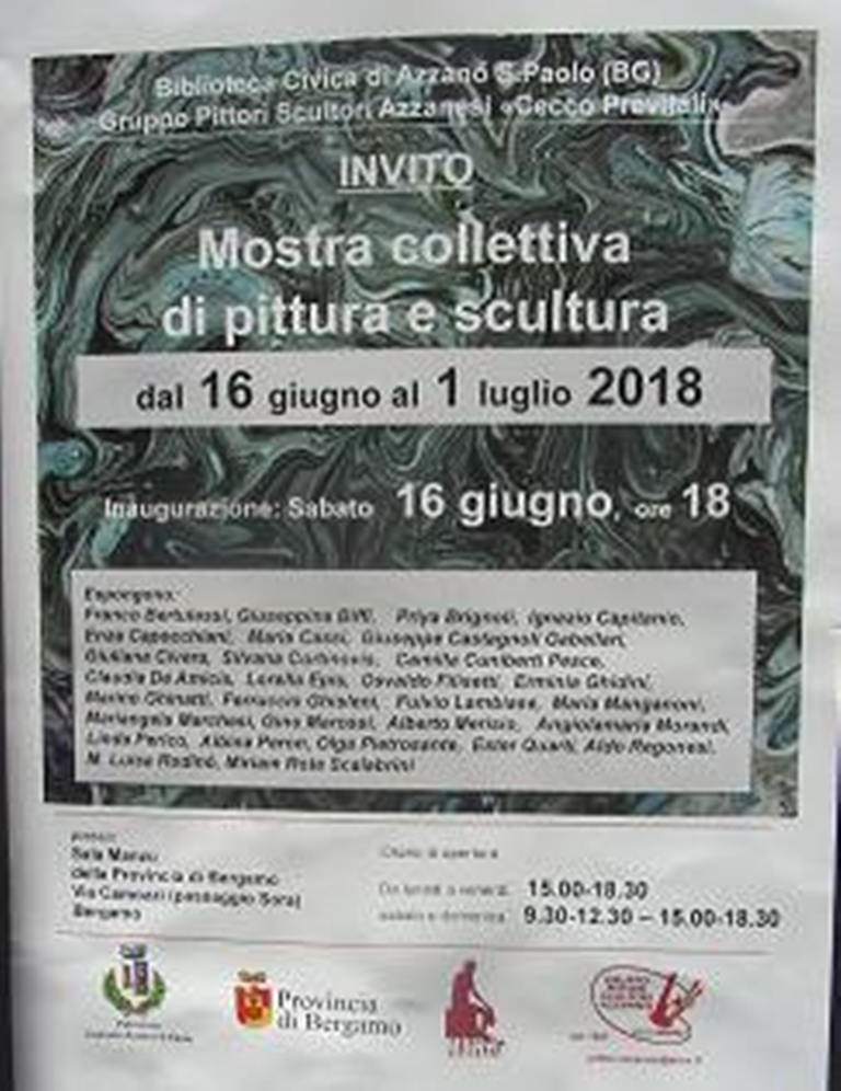 L’accordo dei giorni scorsi con l’Amministrazione Provinciale che finalmente ha aperto alle iniziative culturali anche di comuni della cintura cittadina. Così dal prossimo 16 giugno fino al 1 luglio ( da lun. a ven. ore 15 – 18,30 sab.e dom. 9,30-12,30 15-18,30) sarà allestita e aperta al pubblico la Mostra collettiva di pittura e scultura del sodalizio di Azzano San Paolo.