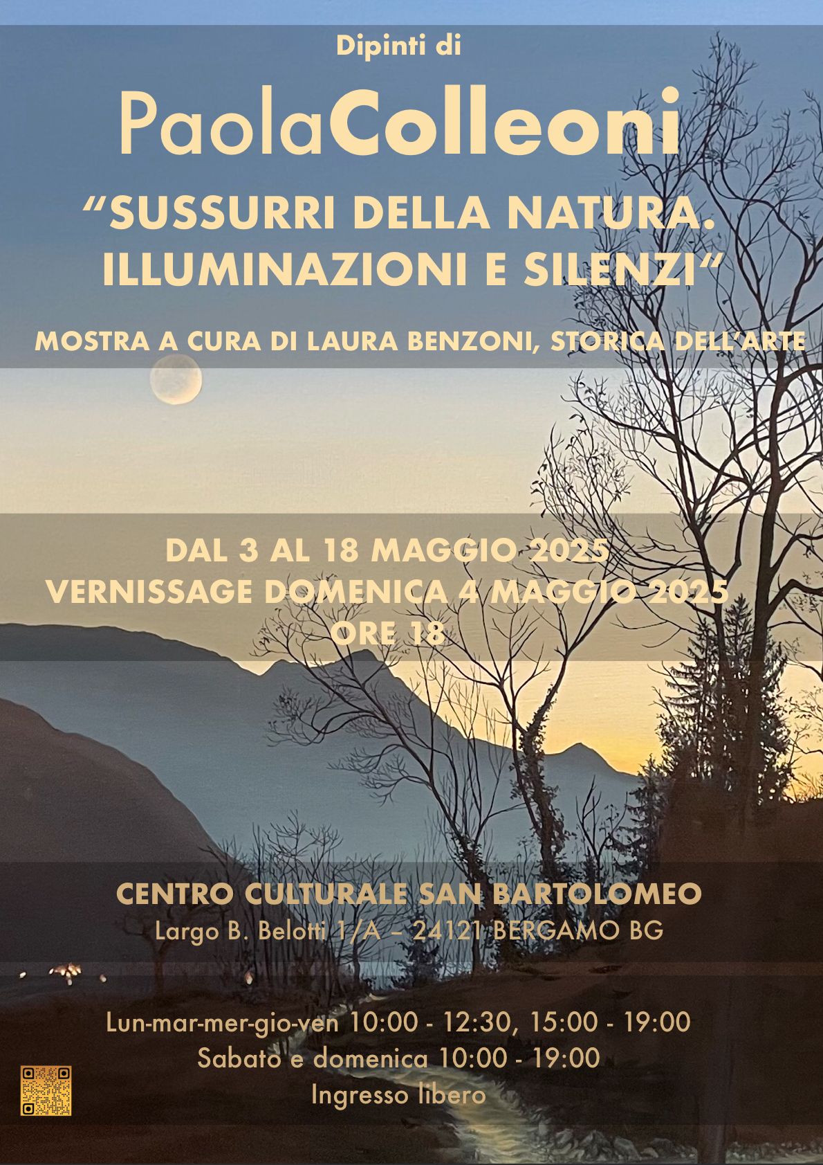 L’artista bergamasca Paola Colleoni si mostra ancora una volta al pubblico della sua città con la nuova mostra “Sussurri della natura. Illuminazioni e silenzi” che verrà inaugurata domenica 4 maggio alle ore 18.00 presso il Centro Culturale San Bartolomeo alla presenza della storica dell’arte Laura Benzoni che dialogherà con l’artista per mettere a fuoco i significati sottesi di una pittura densa di interpretazioni.