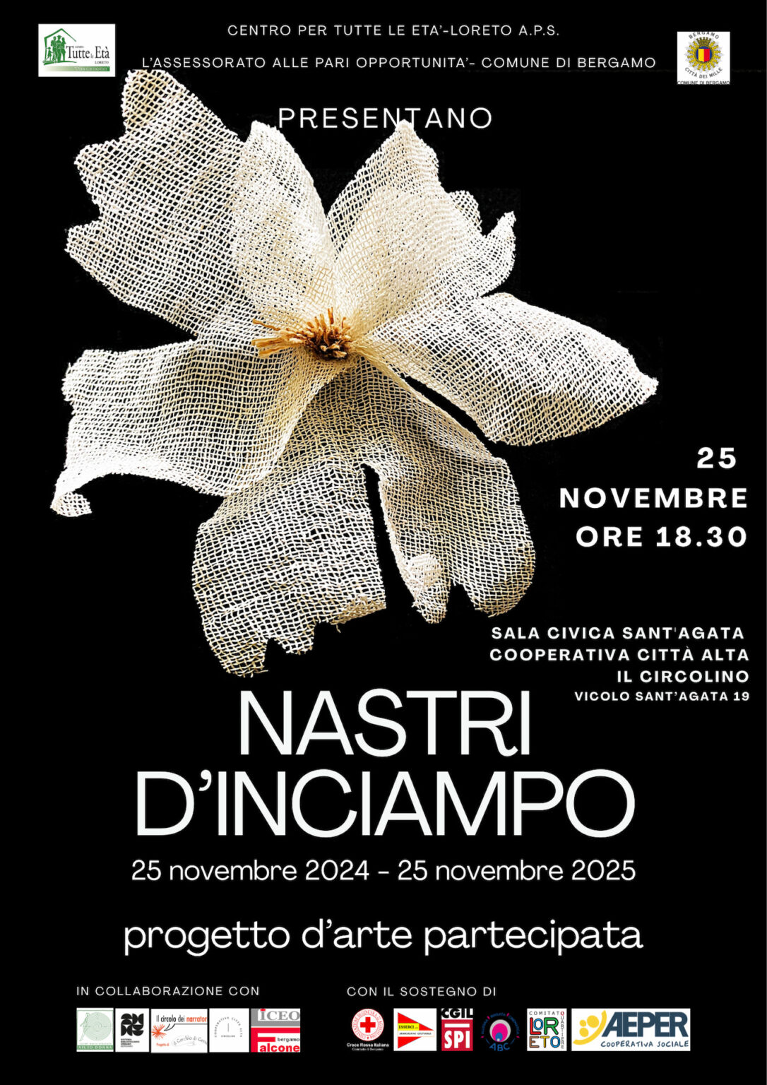 Il progetto Nastri d’Inciampo nasce nell’ambito del CTE di Loreto -Bergamo ad opera di un gruppo di soci e rappresenta un percorso di riflessione, della durata di un anno, sul tema del femminicidio e della violenza di genere, declinato attraverso la realizzazione di una serie di opere tessili. A partire dal 25 novembre 2024, infatti, ad ogni femminicidio il gruppo ha ricamato su un nastro nero il nome e la data di morte della donna uccisa, realizzando nel tempo manufatti artigianali come simbolo di resilienza e di speranza. Queste opere saranno assemblate in un’installazione artistica che troverà spazio presso la sala civica della Cooperativa Città Alta a conclusione di un percorso annuale che ha lo scopo di coltivare il rispetto e la consapevolezza, sostenendo il dialogo e la memoria collettiva contro ogni forma di discriminazione e di violenza di genere.