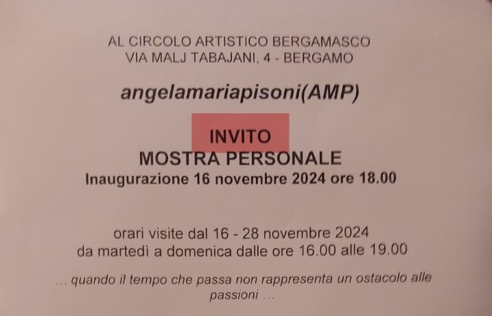 Una mostra da non perdere per gli appassionati di arte: dal 16 al 28 novembre sarà possibile visitare, presso il Circolo Artistico Bergamasco, l'esposizione personale della pittrice e ceramista Angela Maria Pisoni.