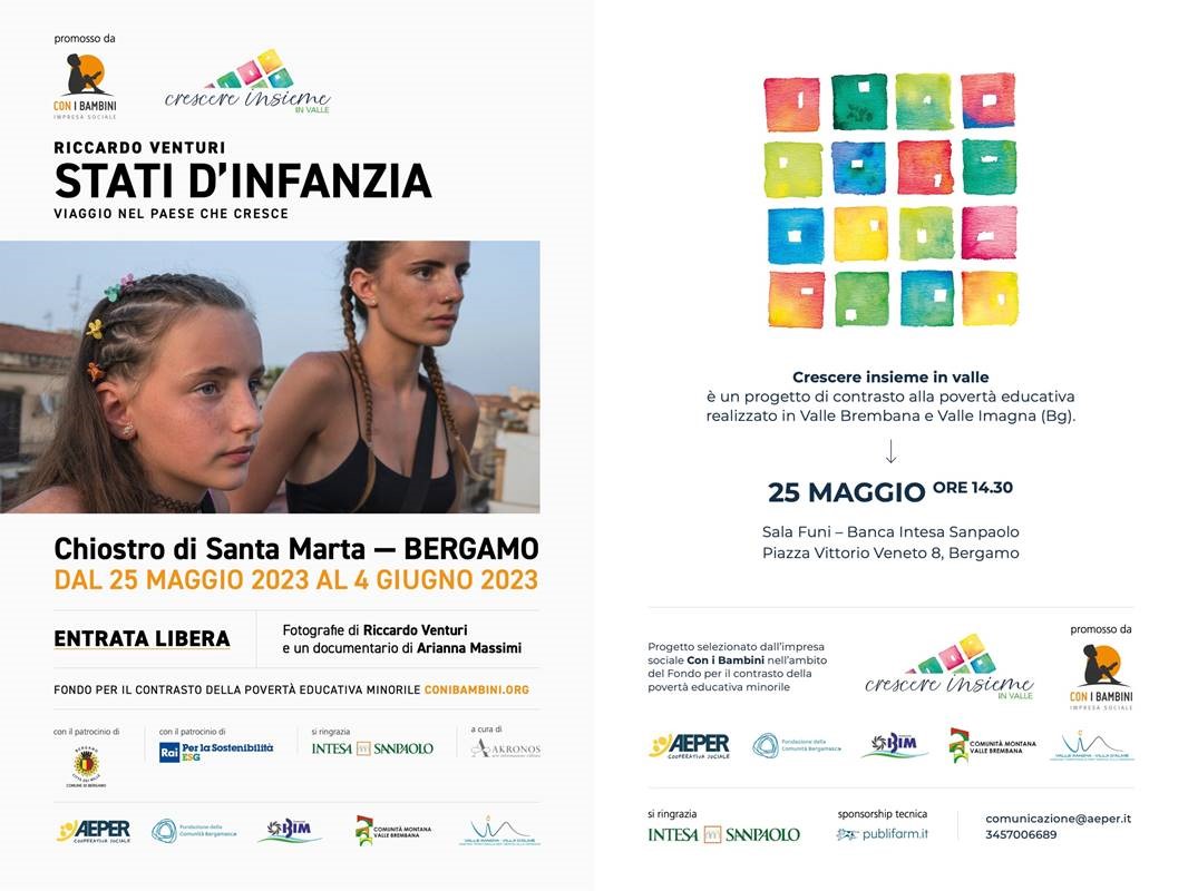 Viaggio nel Paese che cresce, con oltre 50 fotografie di Riccardo Venturi e un documentario a cura di Arianna Massimi, attraversa decine di “cantieri educativi”,tra gli oltre 400 selezionati in tutta Italia e pone al centro del viaggio il tema delle disuguaglianze e delle marginalità, dell’esclusione sociale e della dispersione scolastica con l’obiettivo dimettere in luce la complessità e le difficoltà, ma anche le possibilità di rinnovamento e il cambiodi rotta necessario e possibile attraverso sperimentazioni e “alleanze educative” tra scuola,terzo settore, istituzioni e famiglie così come avviene con i progetti raccontati in mostra.Il progetto multimediale, composto da una mostra fotografica e da un video documentario, è prodotto dall’impresa sociale Con i Bambini, nell'ambito del Fondo per ilcontrasto alla povertà educativa minorile, con il patrocinio della RAI. La curatela è gestita daAssociazione Akronos. Arriva a Bergamo grazie all’ospitalità offerta da Banca Intesa San Paolo,che ha messo a disposizione il chiostro trecentesco di Santa Marta nel centro cittadino, alComune di Bergamo che ha concesso il patrocinio, alla Fondazione della Comunità Bergamascache concorre all’organizzazione.Il lavoro proposto da Riccardo Venturi, due volte Word Press Photo e una lungaesperienza sul tema dell’infanzia, e da Arianna Massimi insiste sull’invisibilità di questi temi, ponendosi in una dimensione di ascolto e rispetto.Il documentario – visibile all’interno della mostra, curata da Ilaria Prili – racconta le esperienzee le impressioni dei protagonisti, dà parola ai ragazzi coinvolti nelle attività dei progetti sostenuti da Con i Bambini, esplora le nuove geografie sociali anche attraverso i contributi di personaggi di spicco del panorama educativo e sociale italiano, tra cui Marco Rossi-Doria,presidente di Con i Bambini e Vanessa Pallucchi, vicepresidente di Legambiente