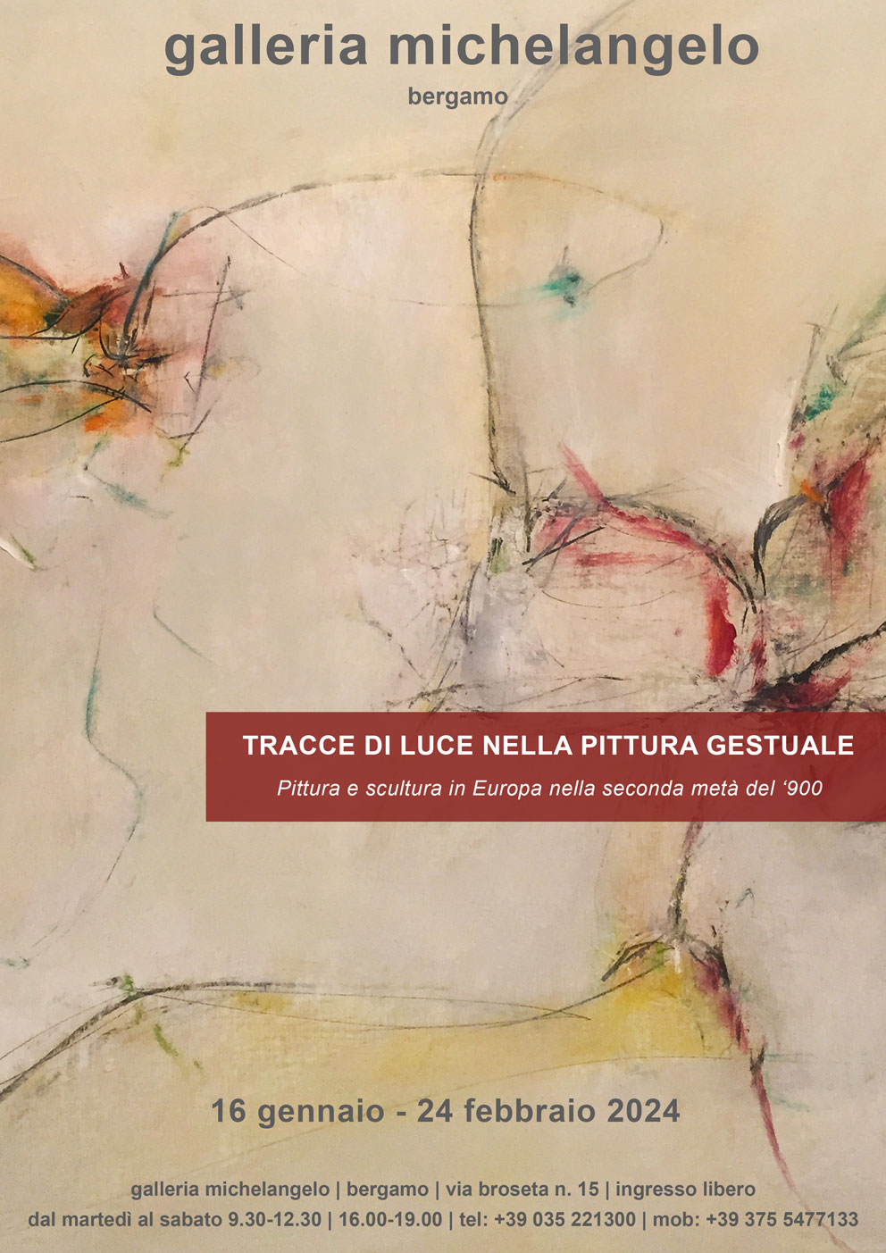 Tracce di luce nella pittura gestualePittura e scultura in Europa nella seconda metà del ‘900 L’esposizione allestita negli spazi della Galleria Michelangelo inizia con due opere dell’artista Jean Messagier (Parigi, 1920 - Montbéliard, Francia, 1999), una delle personalità di maggior rilievo della corrente dell’Astrattismo lirico (École de Paris). Messagier è un instancabile ricercatore della fluidità degli spazi nella luce e nel colore, dove la forma riconoscibile si dissolve, dando vita ad una vibrante gestualità. Consapevole del pericolo di manierismo che comporta un’espressione fondata sulla tecnica manuale, l’artista si assicura che la gestualità emerga da una sensazione profonda, basandosi costantemente su un'emozione autentica.La sua pittura costituisce un formidabile equilibrio tra grafismo e informale materico, tra celebrazione della natura ed astrazione.Vittorio Bellini (Vertova, Bergamo, 1936 – Bergamo, 2009) è in mostra con due opere di grande formato, Il mare di Manu (olio e smalto su tela, cm.100x150), un maestoso scorcio di mare in burrasca irradiato da una luce quasi abbagliante; un susseguirsi di cromatismi armoniosi che conferiscono continuo movimento all’immagine. Per un nuovo mondo (2008), è il titolo della seconda opera proposta che fa parte del suo ultimo ciclo pittorico della serie “Scena dell’eterna infanzia” nel quale l’artista focalizza l’attenzione sul mondo dei bambini dipingendo i loro elementari disegni su opere espressioniste da lui stesso realizzate, su collages di riviste e giornali. Con la materia pittorica, dominata da sprazzi color giallo, miscelata ai ritagli di giornale e con l’uso di lumeggiature bianche, Bellini crea una combinazione ricercata e raffinata. L’effetto estetico in quest’opera è sorprendente.Edouard Pignon, (Bully-Les-Mines, Francia, 1905 - La Couture-Boussey, Francia, 1993) è presente in mostra con L'homme à l'enfant bleu del 1970, caratterizzato da una pennellata vigorosa e da una palette cromatica intensa che enfatizza la forza espressiva della pittura gestuale; una serie di opere nelle quali Pignon esplora il concetto dell'uomo in modo profondo e suggestivo, nelle quali ritrae l'umanità in tutte le sue sfaccettature, dalla gioia alla sofferenza, dalla vulnerabilità alla forza.Con l’opera Figure del 1961 Marcel Burtin (Gafsa, Tunisia, 1902 - Boulogne-Billancourt, Francia, 1979) crea un risalto di forme nel quale la luce dà vita ai soggetti raffigurati; l’artista toscano Guido Strazza, (Santa Fiora, Grosseto, 1922) è presente in mostra con Metamorfosi gialla del 1960, un’opera dal tratto soave, luminosa, ingannevole, colma di tridimensionalità e leggerezza al tempo stesso.Le sculture proposte in mostra trovano spazio in questa esposizione e si uniscono al ritmo di queste grandi tele, creando un connubio affascinante di forme tridimensionali e dipinti vibranti. L'intreccio tra la solidità delle sculture e la dinamicità dei dipinti amplifica l'esperienza sensoriale, trasportando gli spettatori in un viaggio unico attraverso la fusione di arte visiva e tridimensionale.La tela di Douglas Swan (Connecticut, USA, 1930 - Bonn, Germania, 2000) è una scena enigmatica, una figura sollevata da terra quasi aleggiante si staglia al centro del dipinto, quasi a voler simboleggiare il passaggio tra la vita e la morte, il tutto enfatizzato da questa una luce che campeggia sullo sfondo.Aldo Calò (San Cesario di Lecce, 1910 - Roma, 1983) si riconosce nella sinuosità della forma, giochi di ombre e luci che si proiettano all’interno dell’incavo di legno. Nell’opera lignea di Yasuo Fuke (Giappone, 1929) un grosso cerchio domina lo spazio, quasi un simbolo di sole e luce presente in moltissime civiltà millenarie.Artisti in mostra:VITTORIO BELLINI - BEN VAUTIER - MARCEL BURTIN - ALDO CALO’ – ALFONSO FRASNEDI - YASUO FUKE - JEAN MESSAGIER - MARCEL MEYLAN - JEAN PIAUBERT - EDOUARD PIGNON - DOUGLAS SWAN - GUIDO STRAZZA - MARIE-CHRISTINE TREINEN