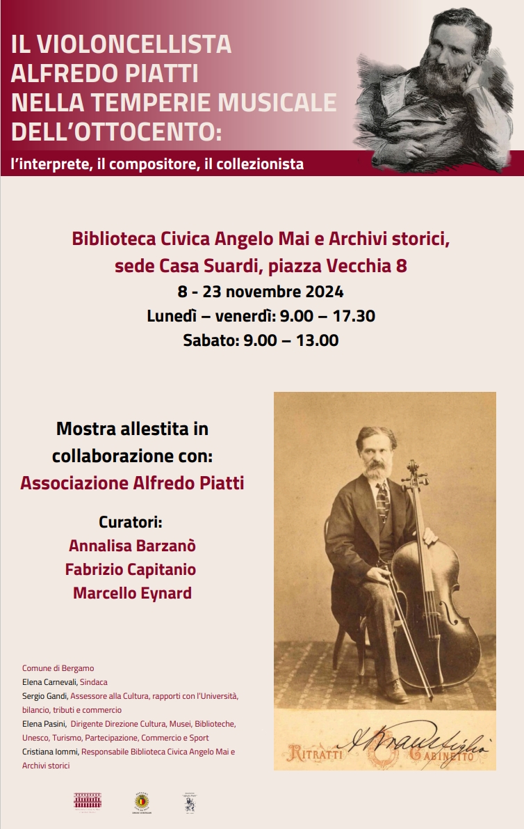 Venerdì 8 novembre 2024, alle ore 18, presso la sede Casa Suardi, viene inaugurata la mostra Il violoncellista Alfredo Piatti nella temperie musicale dell’Ottocento: l’interprete, il compositore, il collezionista, allestita con materiale documentario conservato presso le biblioteche Gaetano Donizetti e Angelo Mai.