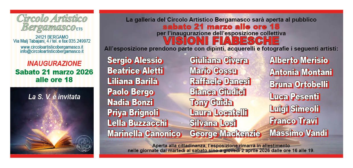 Dal 21 marzo al 2 aprile, al Circolo Artistico Bergamasco รจ in programma un'esposizione collettiva che intende descrivere in arte visioni fiabesche.