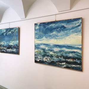 Tramonti incandescenti, tempeste in cui il cielo si confonde con il mare in burrasca, cieli accarezzati dal vento, cieli argentati e grevi, cieli tersi e sereni. Sotto le superfici lucenti e il tratteggio fortemente ondulato, i colori si mescolano creando atmosfere tempestose.
