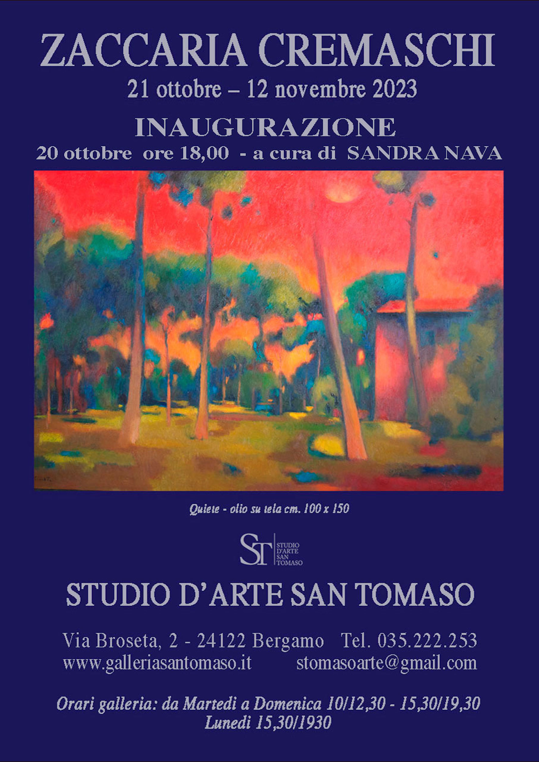 Dopo il successo delle precedenti esposizioni, la galleria Studio d’Arte San Tomaso presenta, dal 21 ottobre al 12 novembre 2023, presso i propri locali di via Broseta 2 a Bergamo, la mostra dedicata al pittore Zaccaria Cremaschi. Nato ad Albano Sant’Alessandro nel 1949, dal 1966 al 1973 frequenta i corsi di pittura all’Accademia Carrara sotto la guida di Trento Longaretti, e sempre nel 1973 frequenta presso l’Accademia di Salisburgo i corsi di pittura diretti dal Prof. De Luigi. Ha esposto in numerose mostre sia collettive che personali realizzate in importanti gallerie sia in Italia che all’estero.