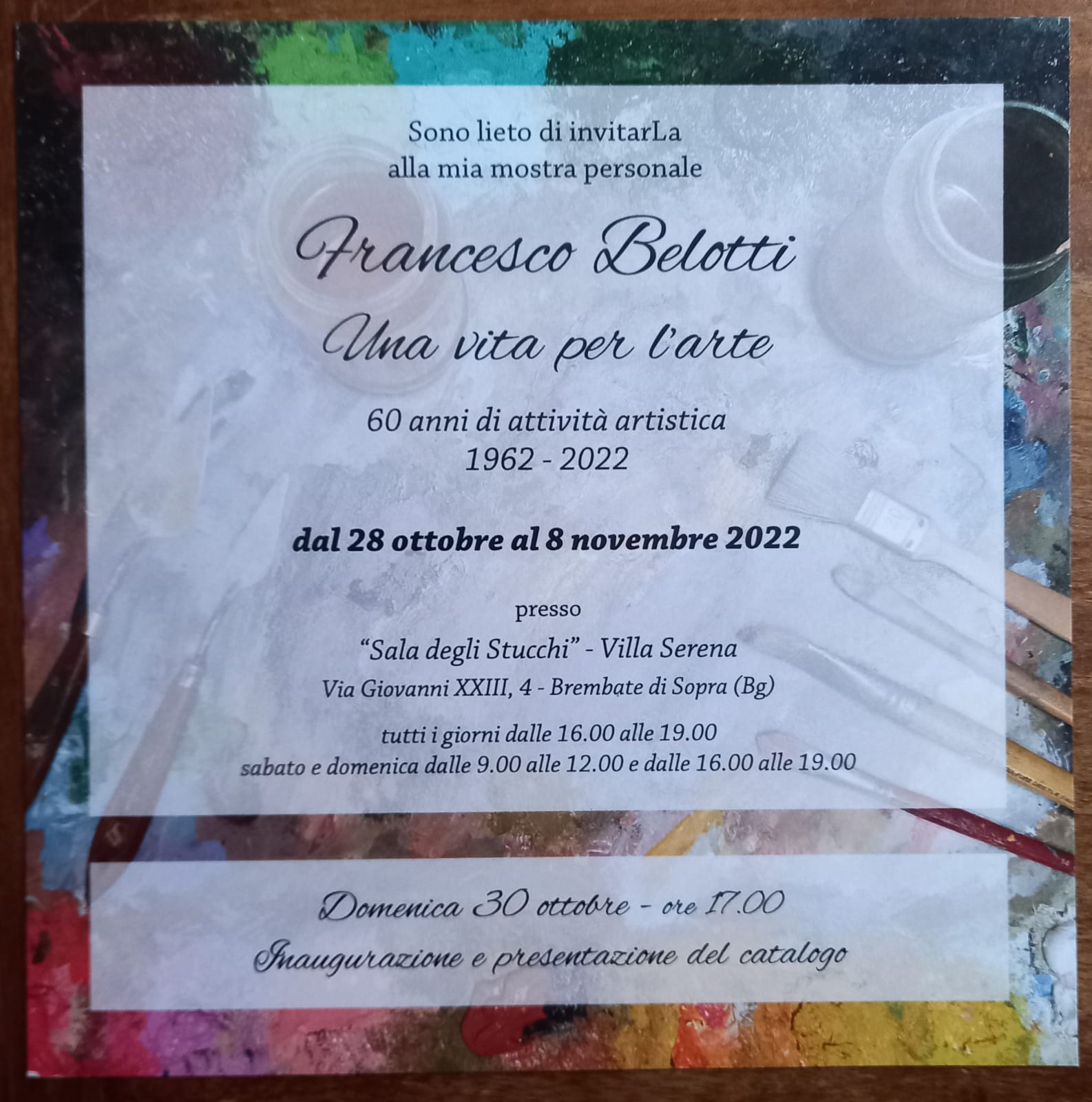 Inaugurazione della mostra retrospettiva di pittura di Francesco Belotti in occasione dei suoi sessantโanni di attivitร artistica. Nellโoccasione verrร presentato anche il catalogo con una selezione dei principali lavori di Belotti.